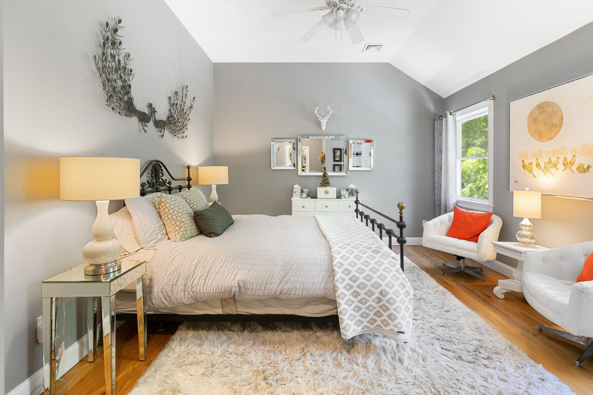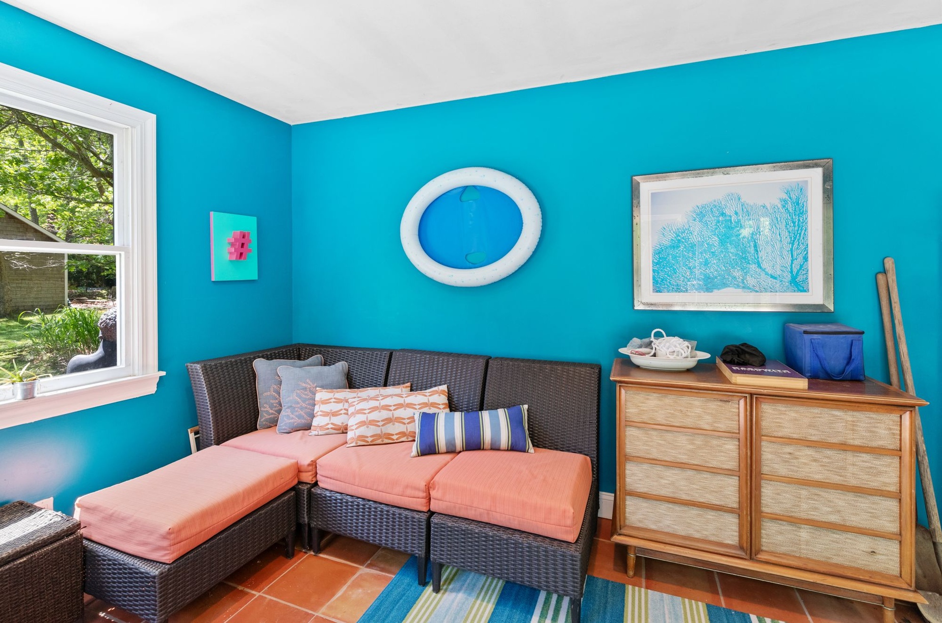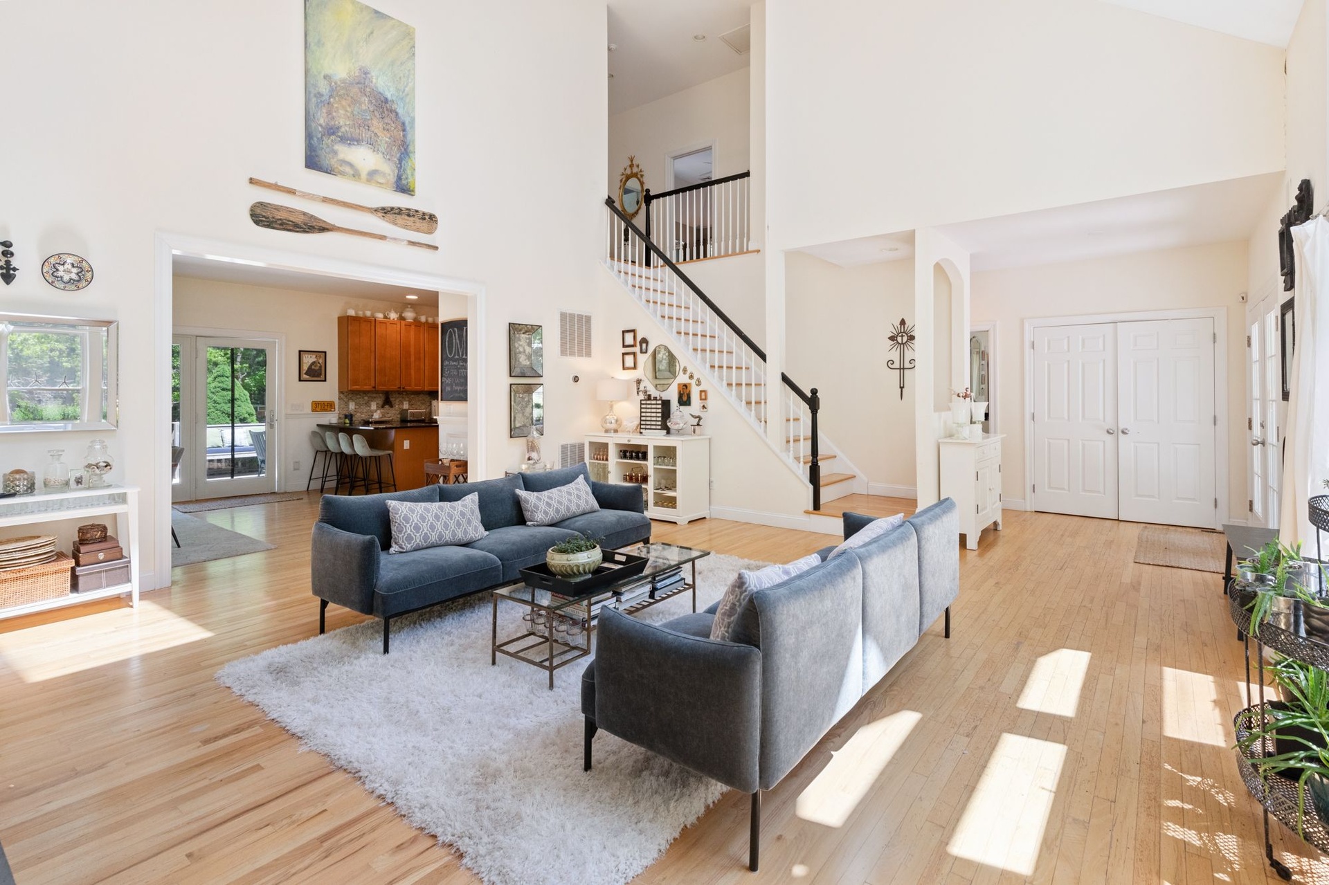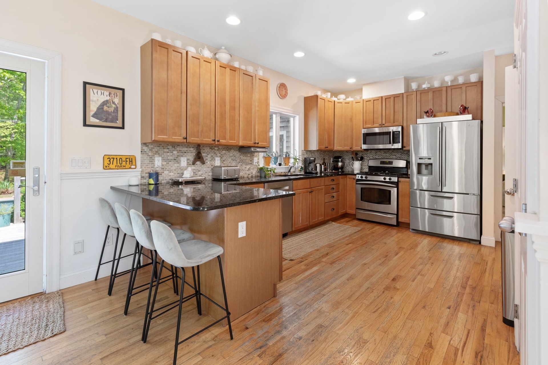Spacious, light-filled home featuring 4 bedrooms, 4.5 baths, fireplace and open kitchen/dining area. There's a screened-in porch, a large deck beside the pool and a pool house. The house is in a secluded area, surrounded by nature, just minutes to the beach, town, shopping, restaurants and you can walk to the bay.