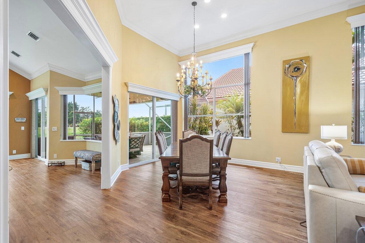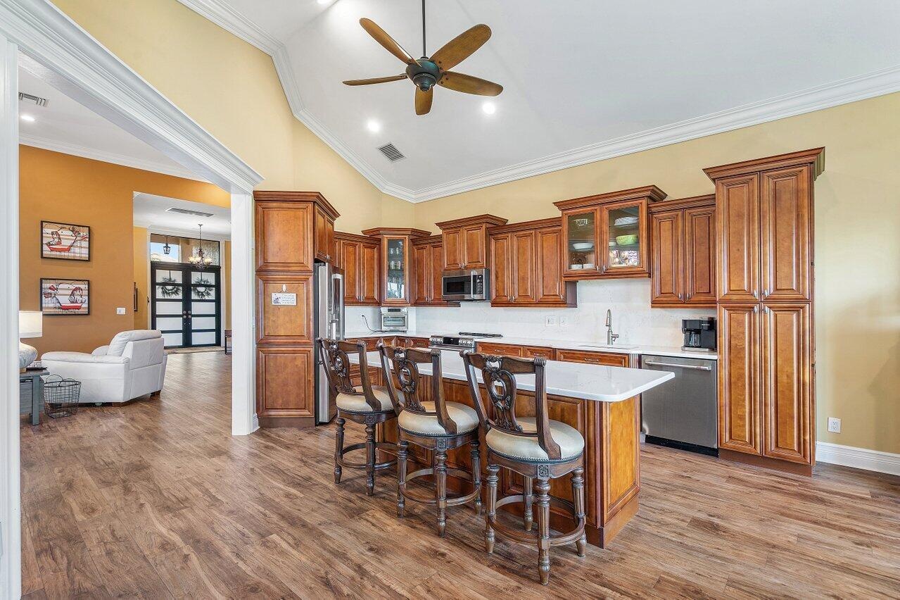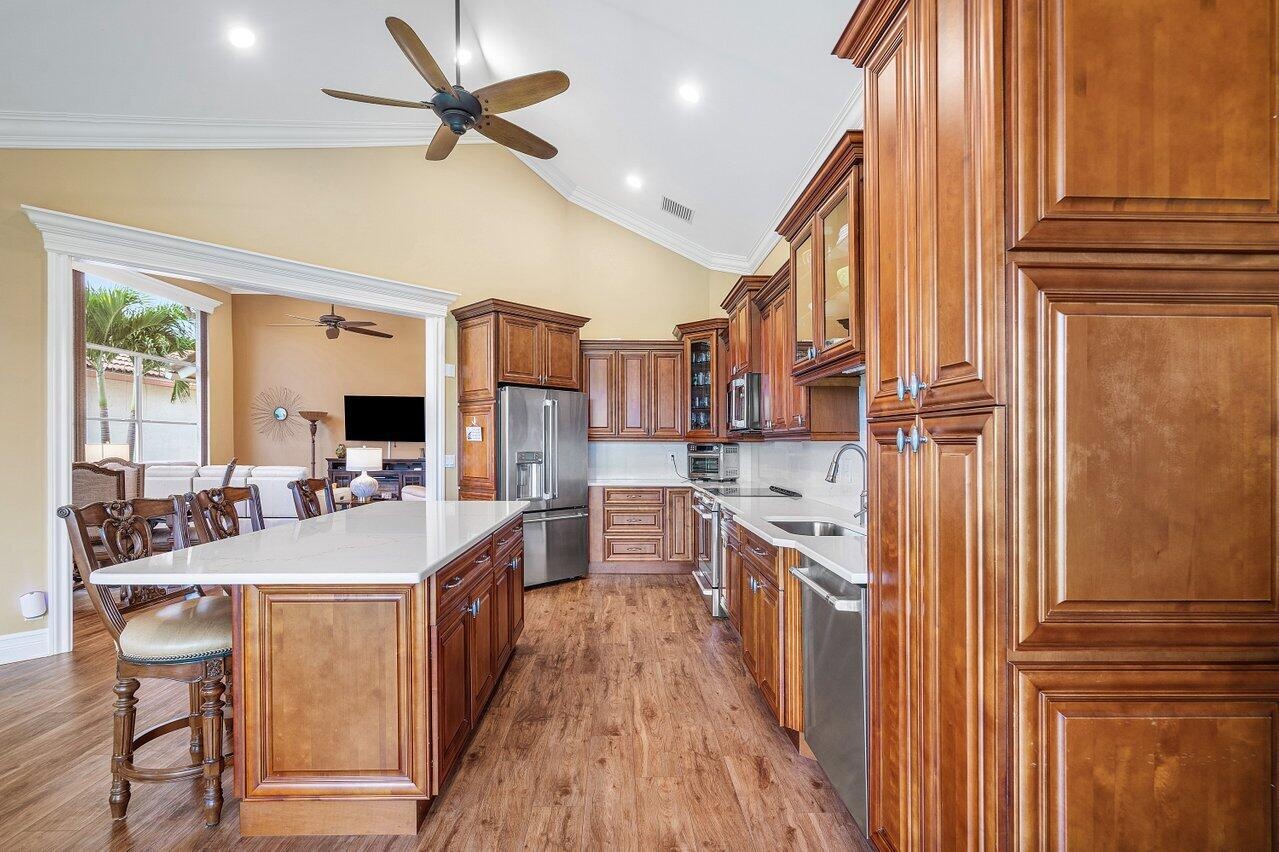 Live the lifestyle you deserve in this beautifully appointed 2-bedroom + den/office, 2.5-bath single-family home, nestled within the highly desirable gated 55+ community of Indian Spring in Boynton Beach. This light-filled residence features soaring 14-foot ceilings, wood-style flooring, and hurricane-impact windows and doors, bathing the home in natural light while offering peace of mind. The spacious, open-concept layout is ideal for both everyday living and entertaining, with sweeping golf course and lake views that create a tranquil and vibrant backdrop. The oversized kitchen is a chef's dream, showcasing sleek quartz countertops, stainless steel appliances, ample cabinetry, and generous workspace--perfect for hosting or casual meals at home.