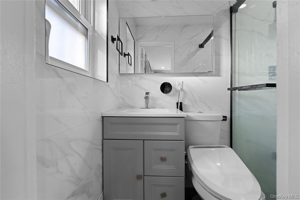 - Bathroom with a stall shower, tile walls, vanity, and decorative backsplash