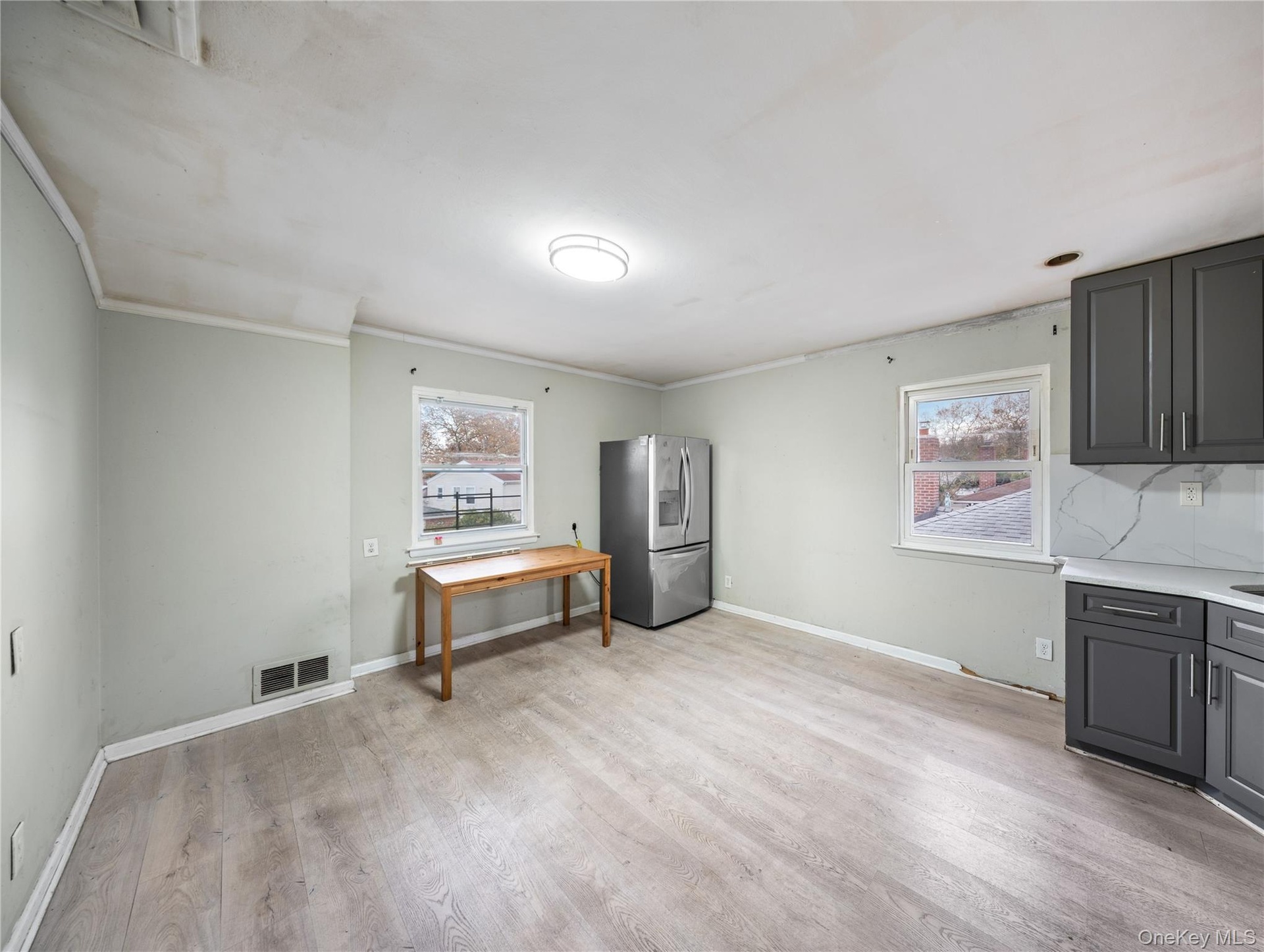 - Bedroom with light wood-type flooring, crown molding, and an office area