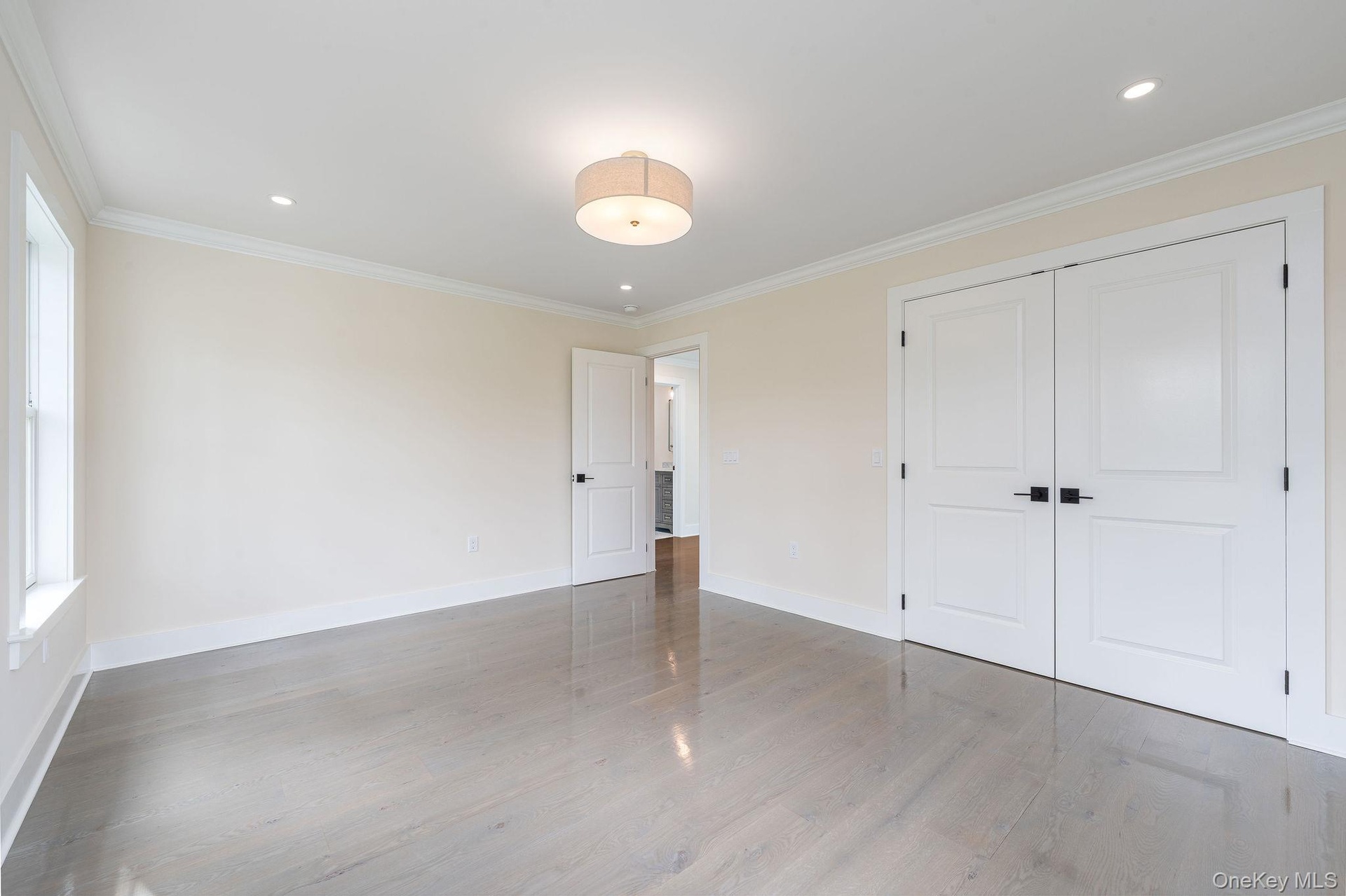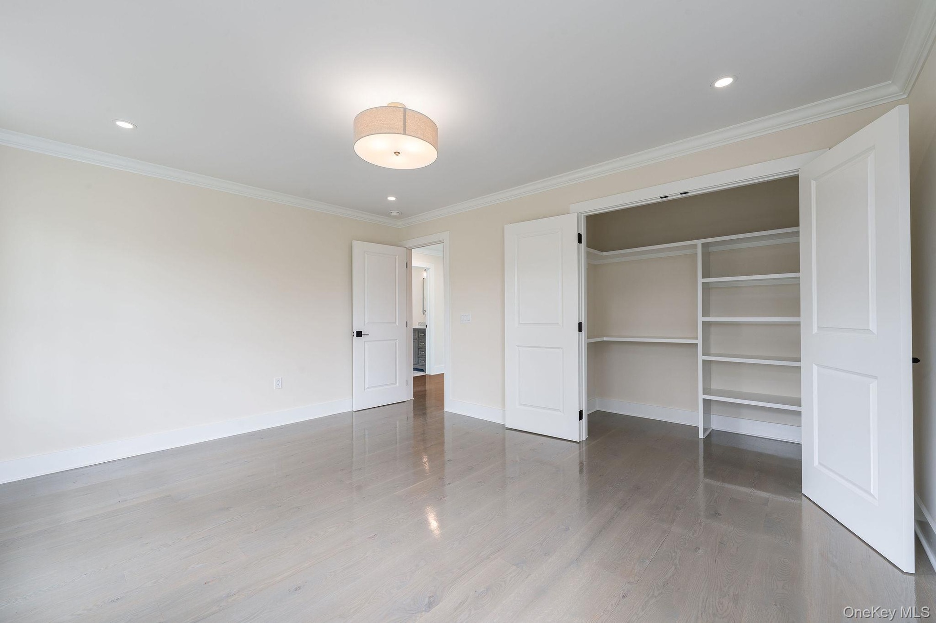 - Unfurnished bedroom with ornamental molding, recessed lighting, a closet, and wood finished floors
