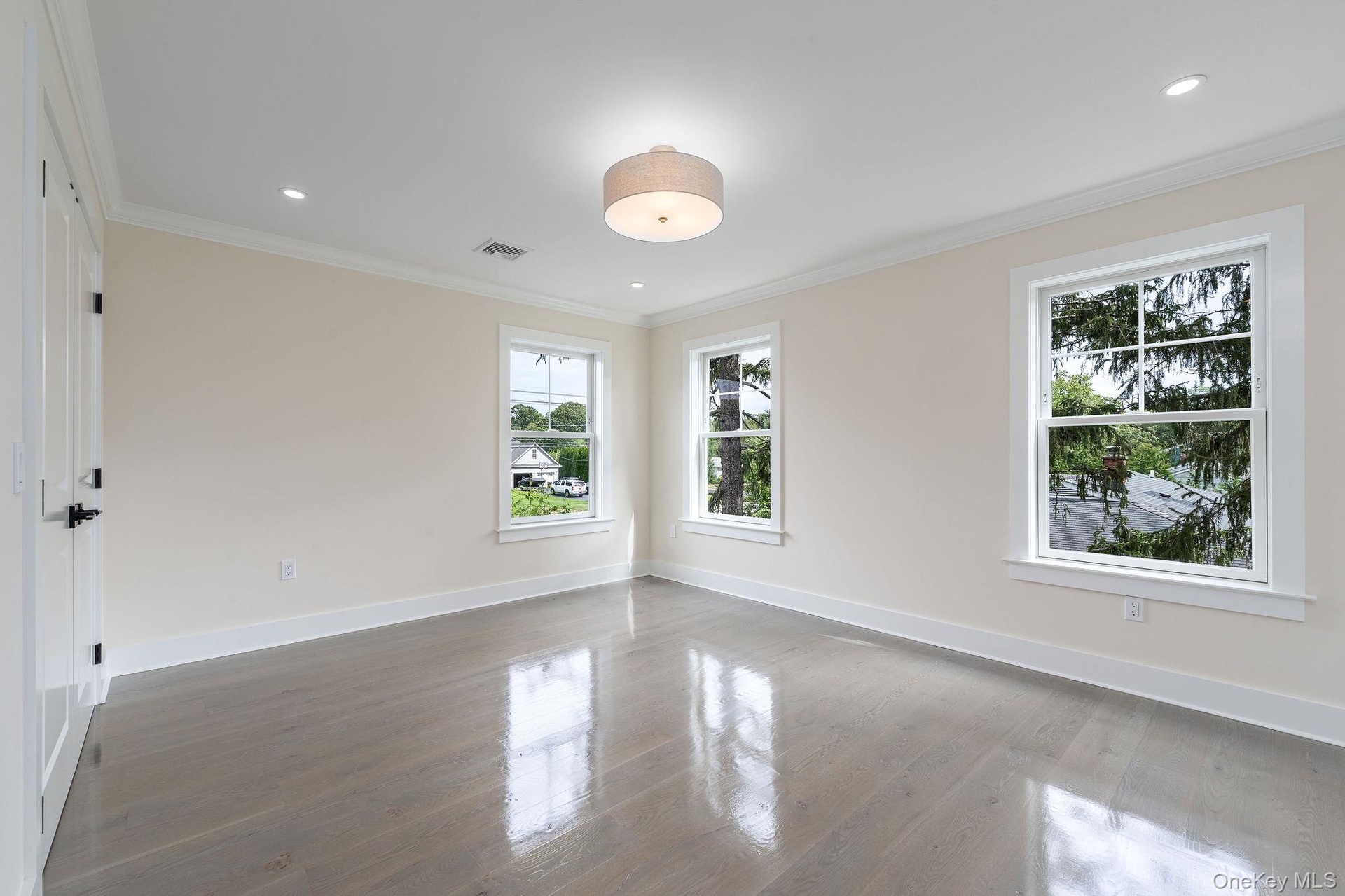 - Empty room featuring ornamental molding, light wood finished floors, and recessed lighting