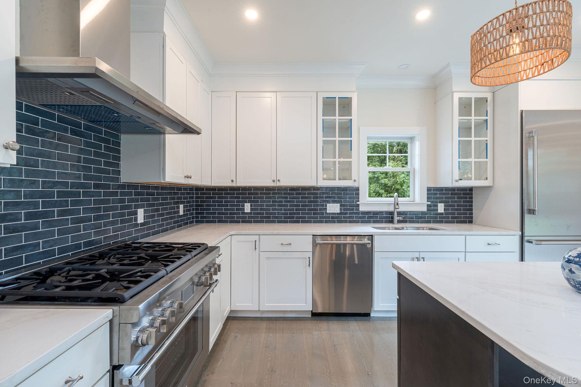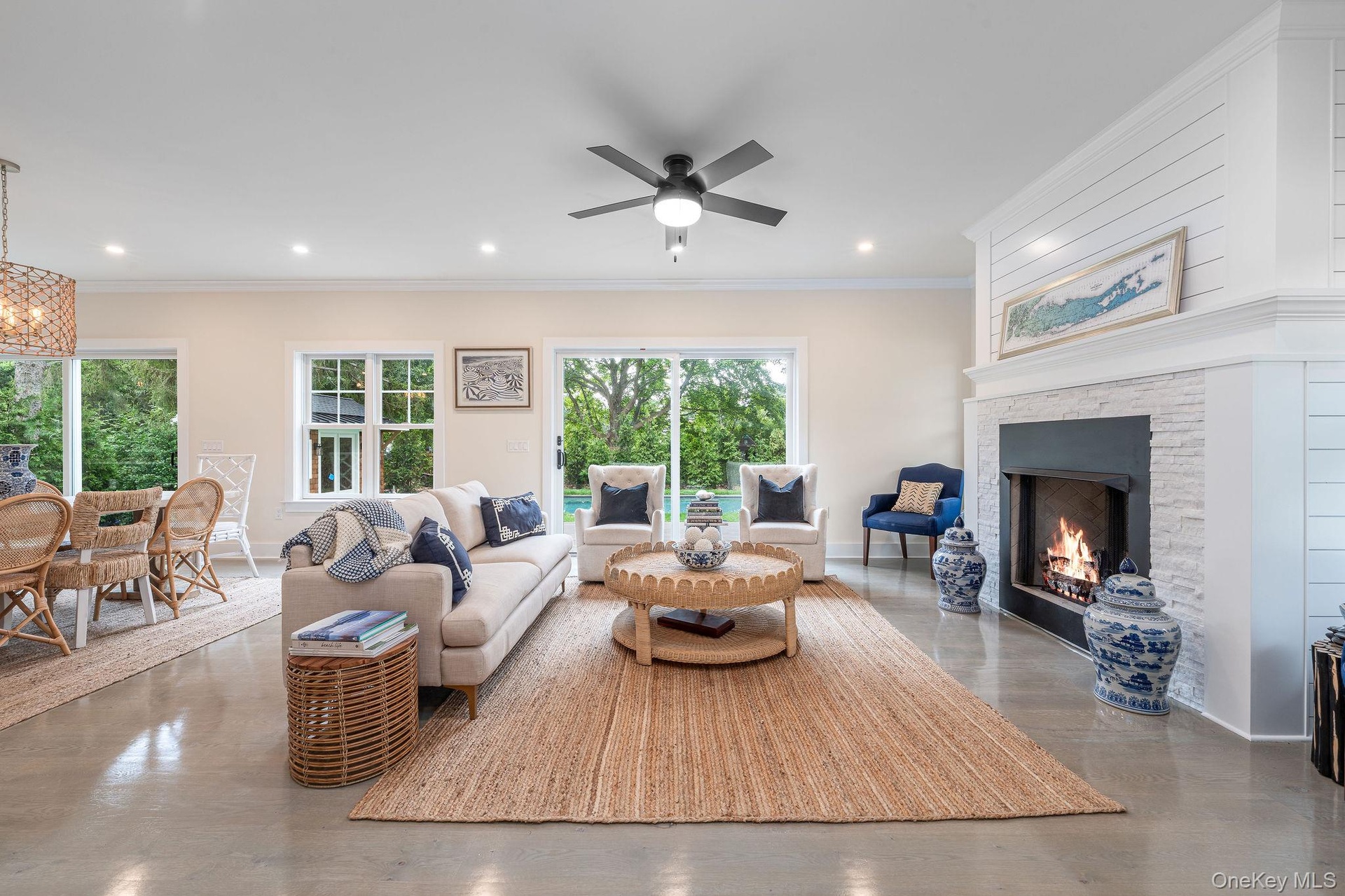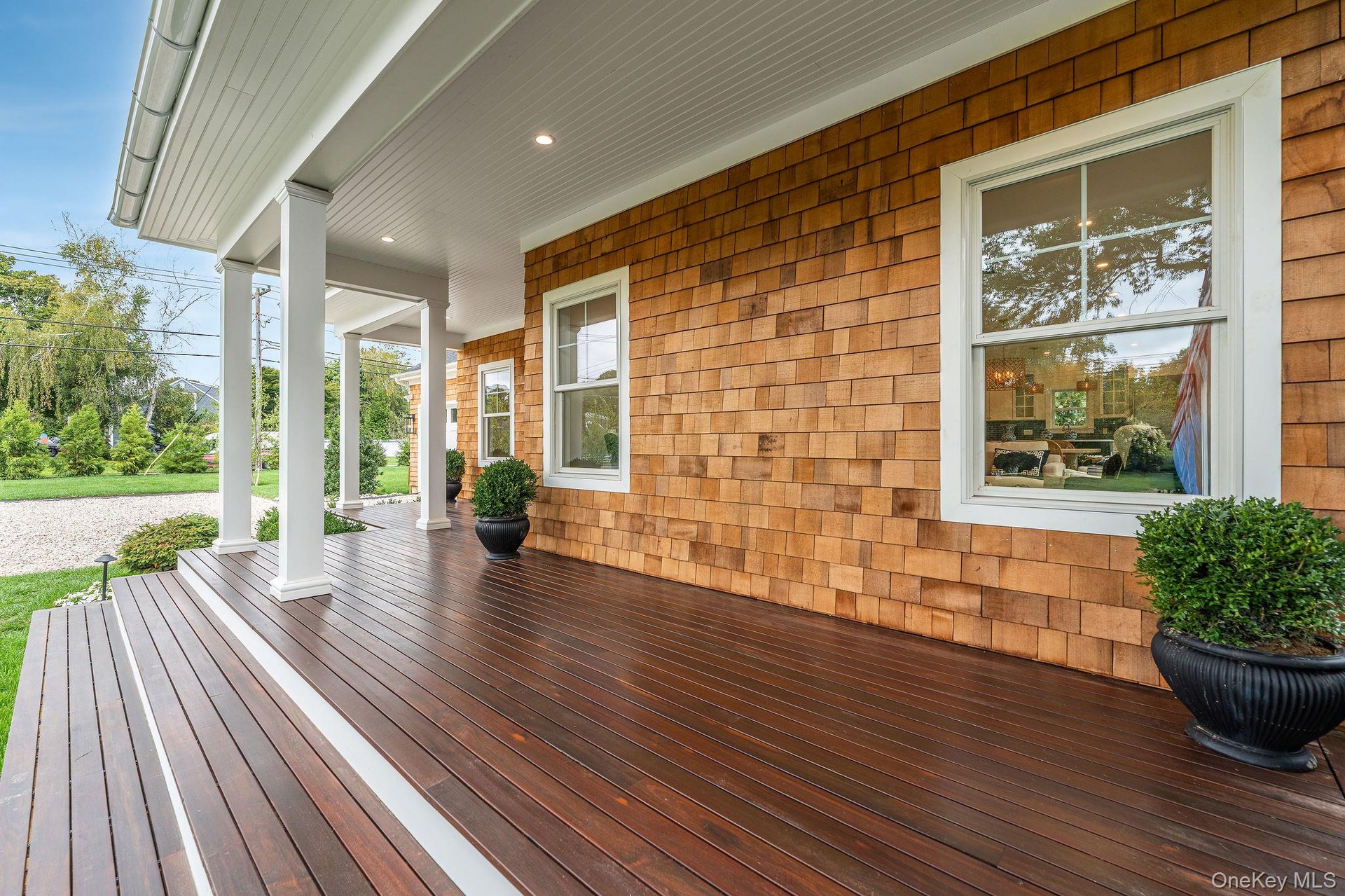 Welcome to this luxurious new construction in the heart of South Jamesport, just half a mile from the beach and 200 yards from deep-water marina. Located in an exceptional neighborhood, this beautifully crafted home features 3 spacious bedrooms and 2.5 elegant bathrooms, including a stunning primary ensuite with a marble bathroom, double vanity, and large custom closets. Designed with an open-concept layout, the entire home boasts 7-inch wide oak wood floors, a cozy gas fireplace, and a gourmet kitchen equipped with premium Thermador appliances. The full basement, with 9-foot ceilings and two egress windows, offers the potential to add up to two additional bedrooms-perfectly aligned with the septic system already approved for five bedrooms. Step outside to enjoy a 16x32 heated inground gunite saltwater pool, surrounded by professional landscaping, landscape lighting, and an irrigation system. A charming front porch with a tropical wood deck completes this exceptional offering, blending refined interior design with resort-style outdoor living.