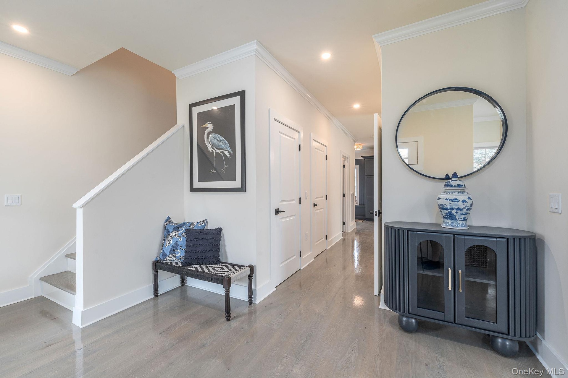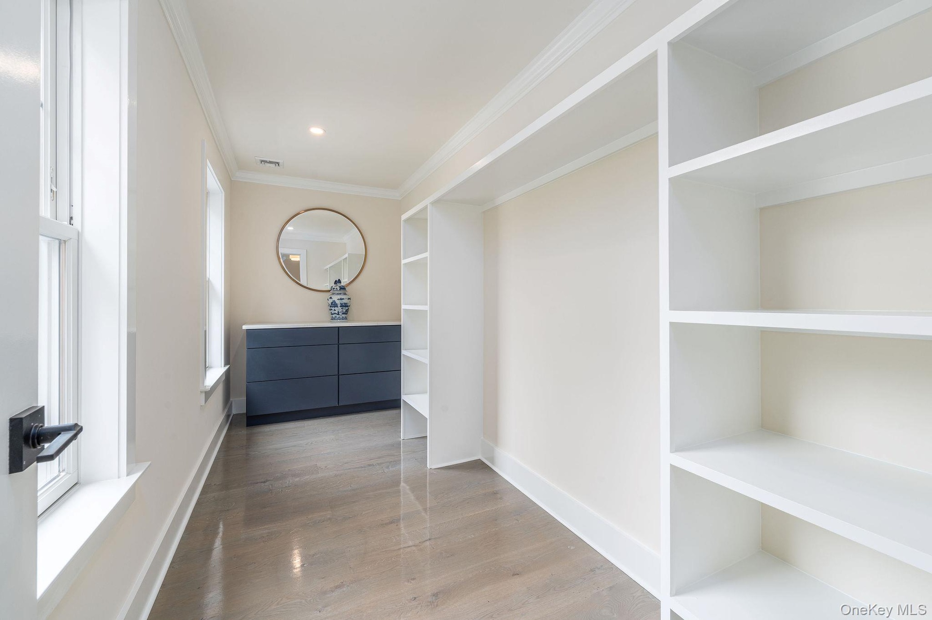 - Hall with light wood finished floors, ornamental molding, recessed lighting, and built in shelves