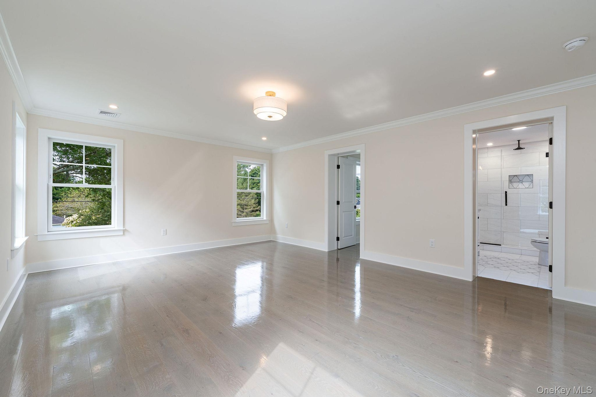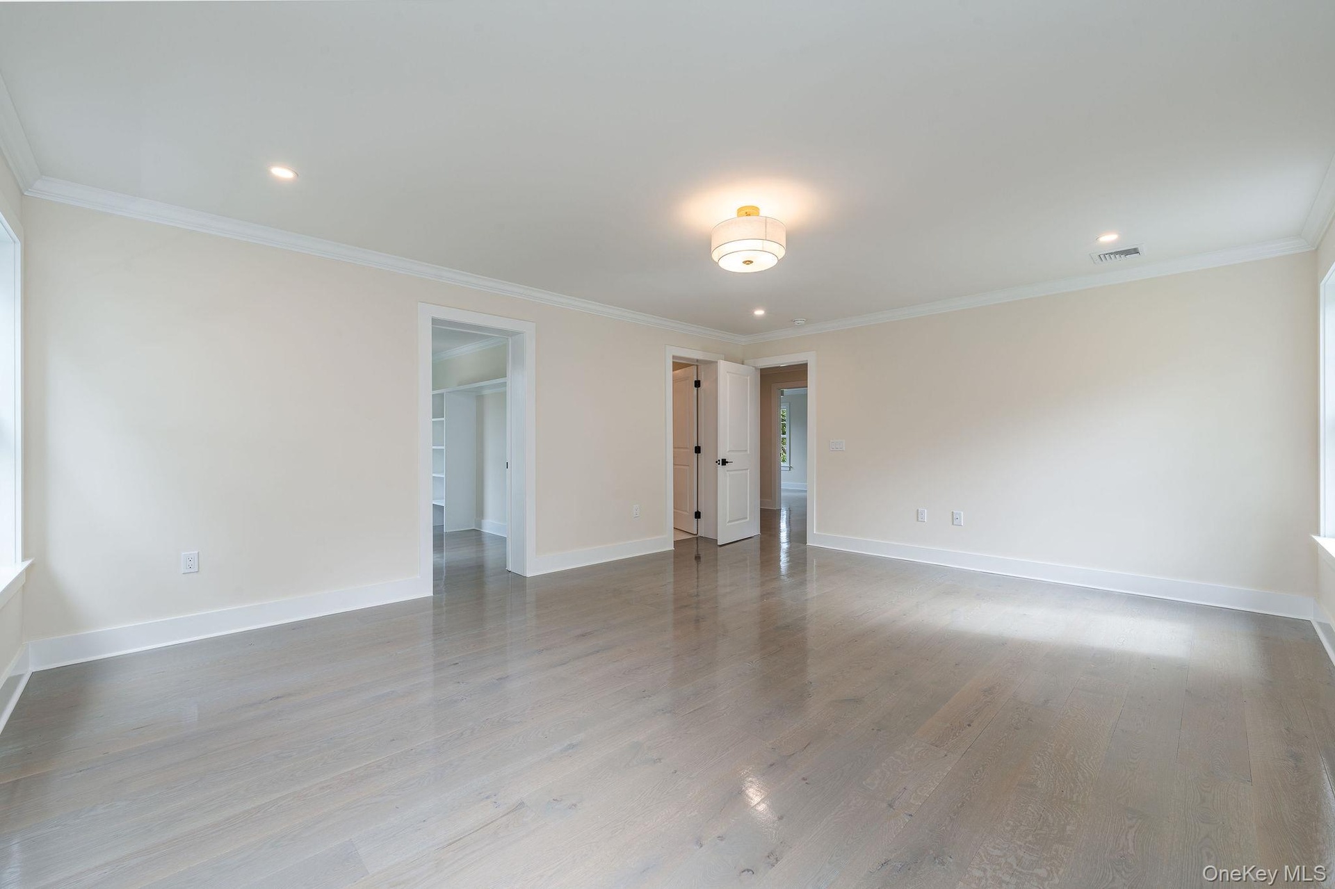 - Empty room with crown molding, light wood-style floors, and recessed lighting