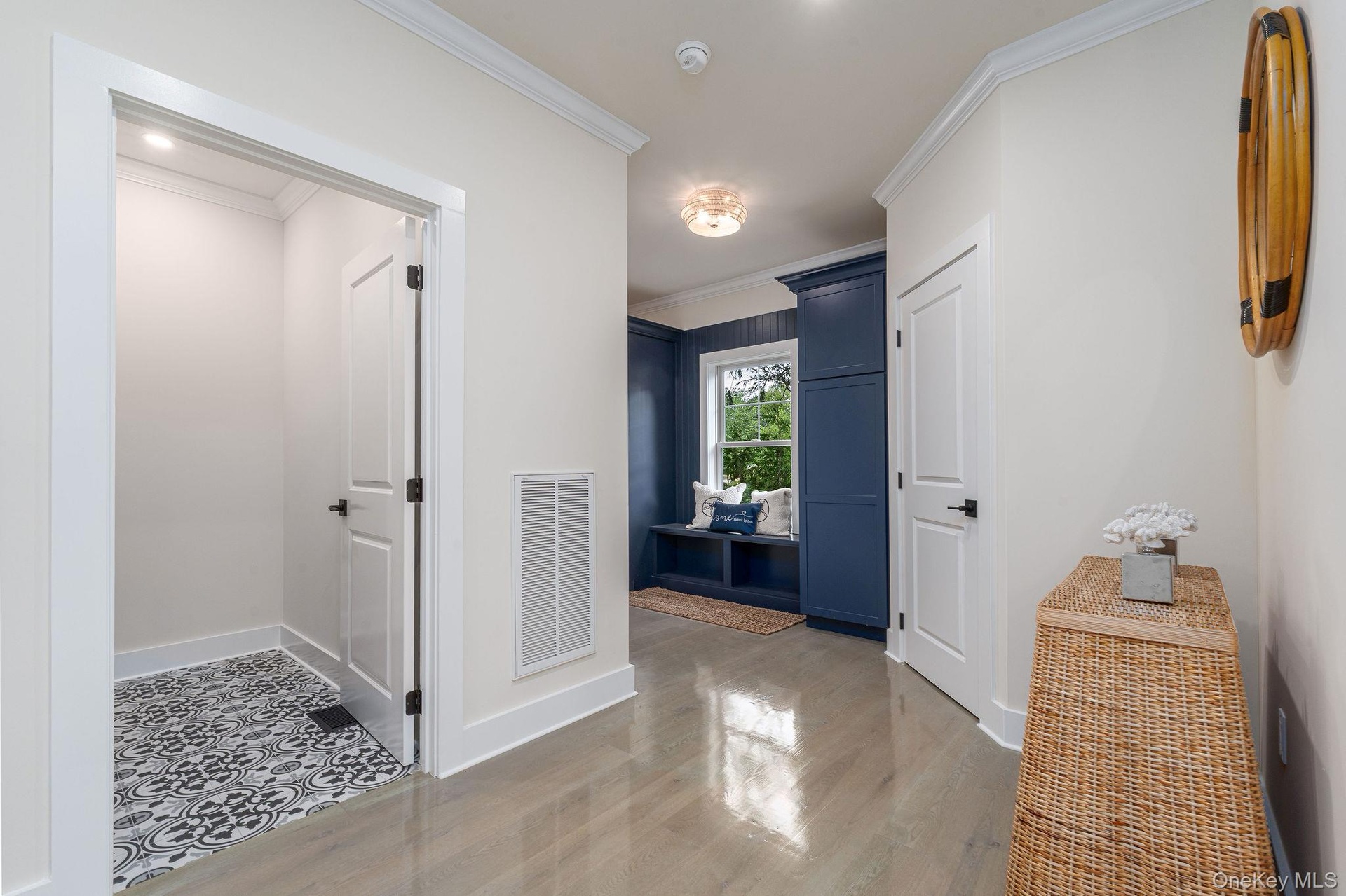 - Mudroom with wood finished floors and ornamental molding