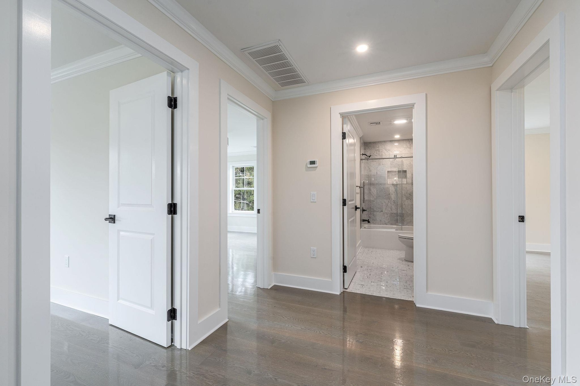 - Hallway featuring dark wood-style flooring, ornamental molding, and recessed lighting
