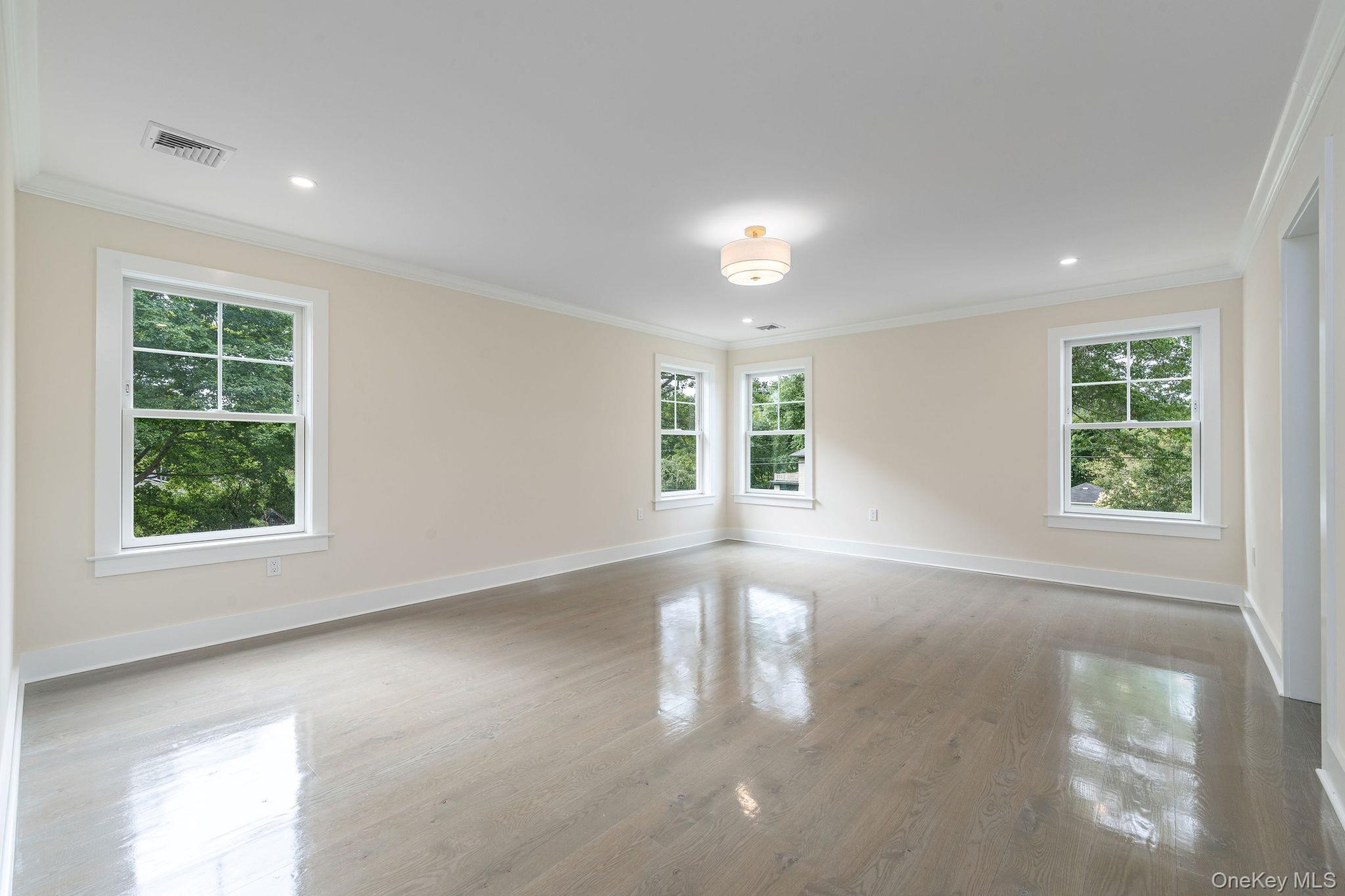 - Empty room featuring ornamental molding, light wood-style floors, and recessed lighting
