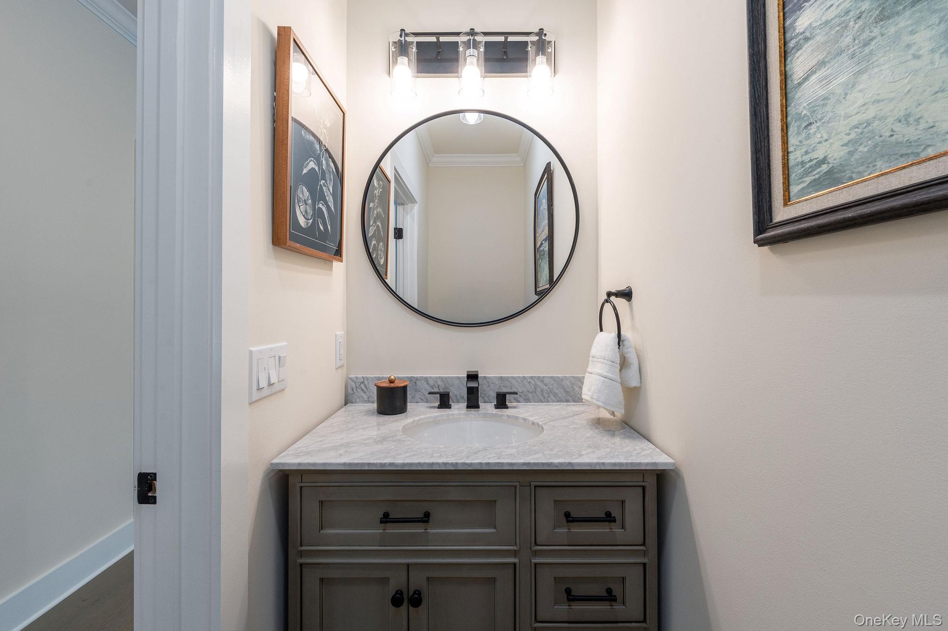 - Bathroom featuring vanity and crown molding