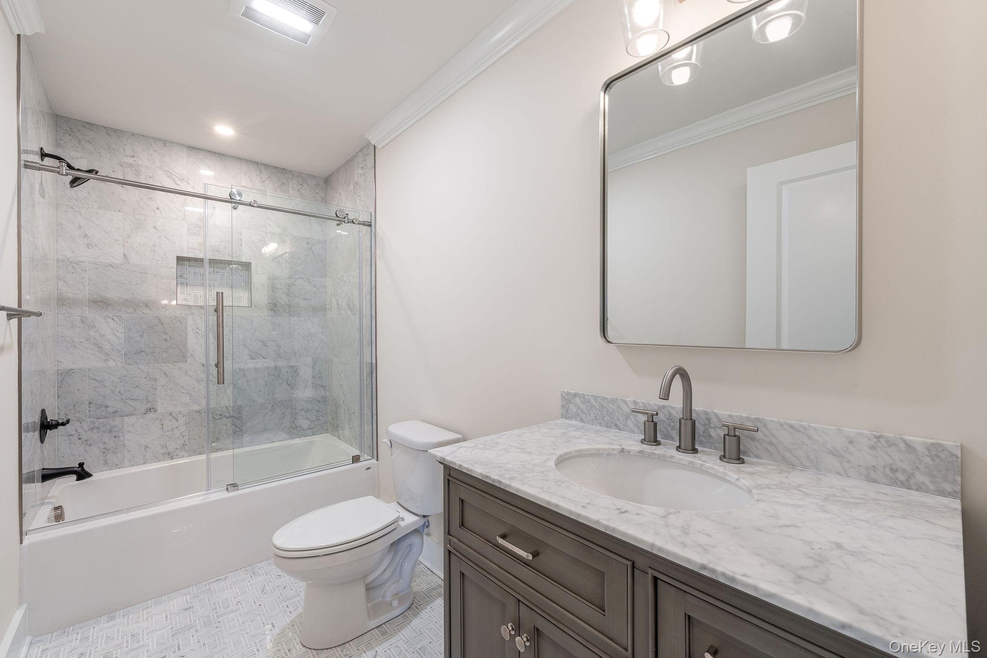 - Full bath featuring enclosed tub / shower combo, vanity, crown molding, and recessed lighting
