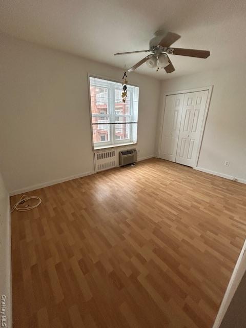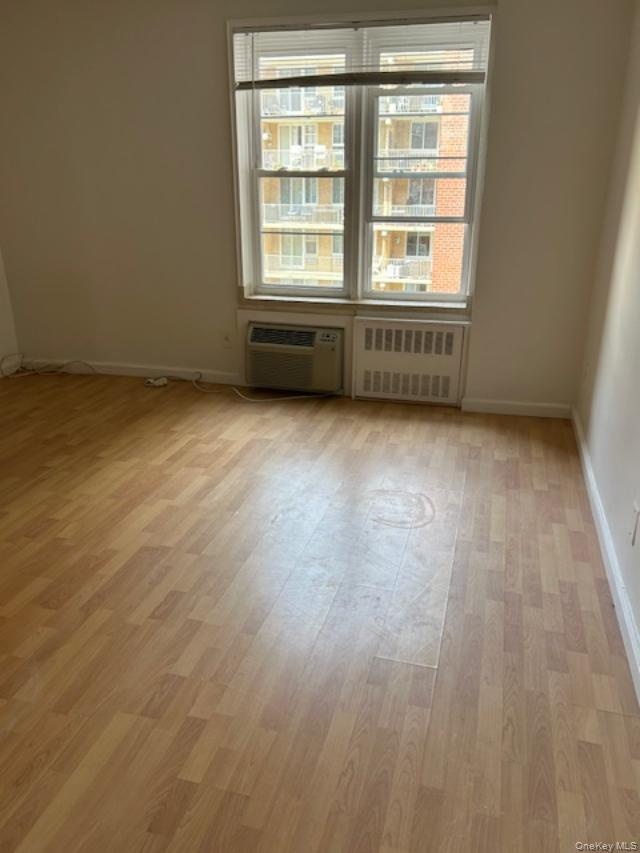- Empty room with radiator, light wood-style flooring, and a wall mounted AC