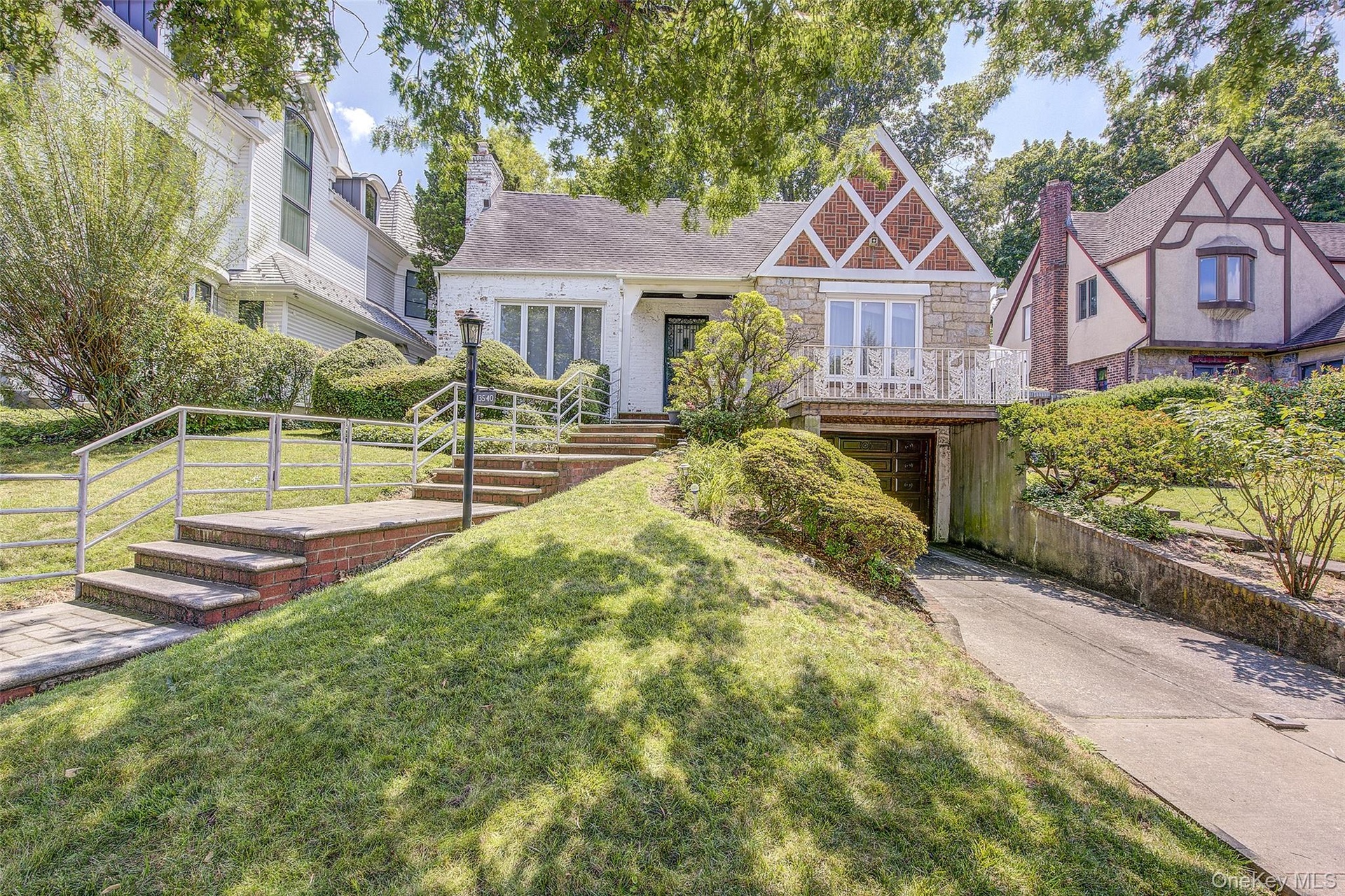 - Tudor-style house with stone siding, a front yard, a chimney, driveway, and a garage