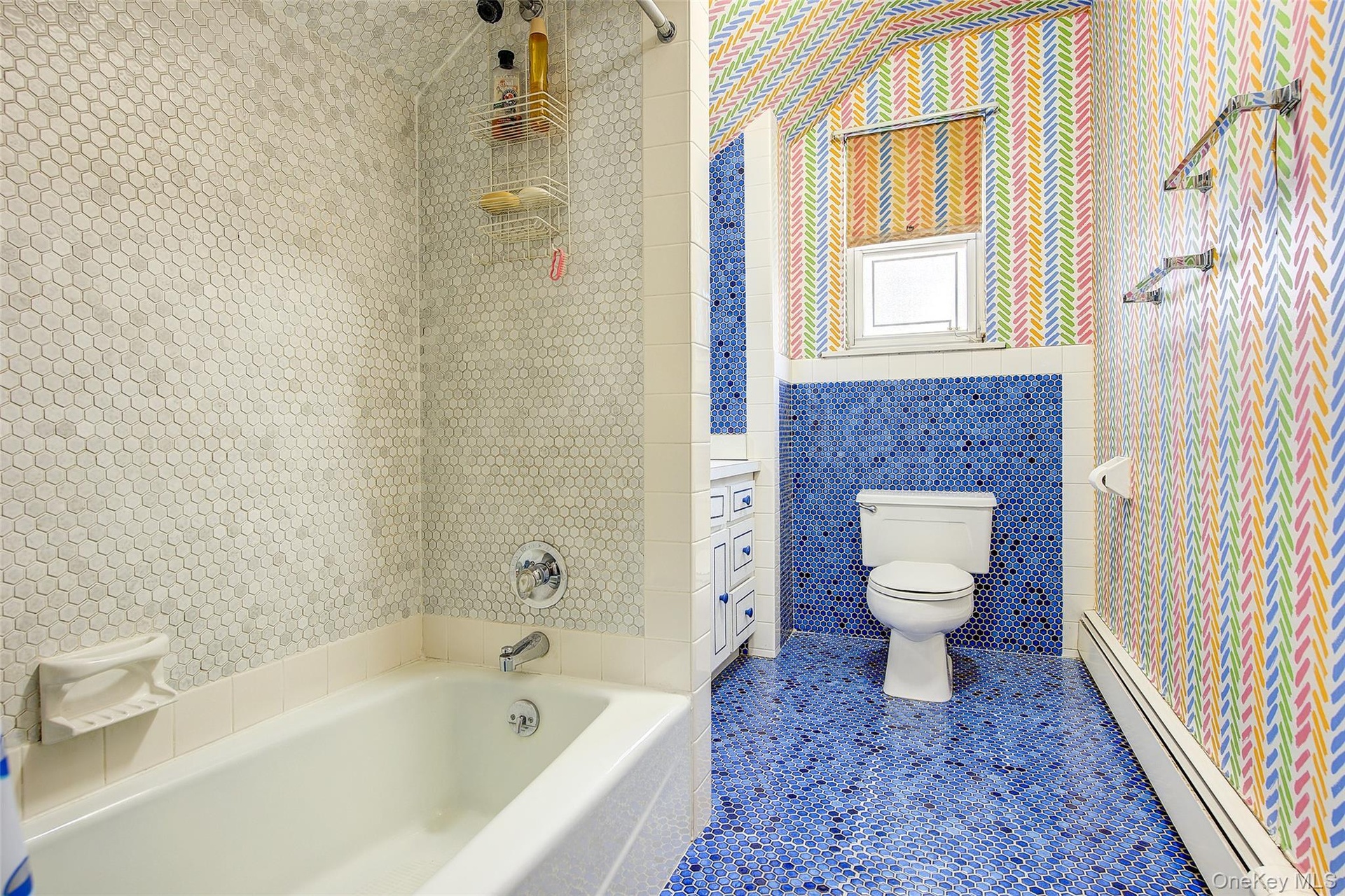 - Bathroom featuring a baseboard radiator, tile walls, wallpapered walls, and tile patterned floors