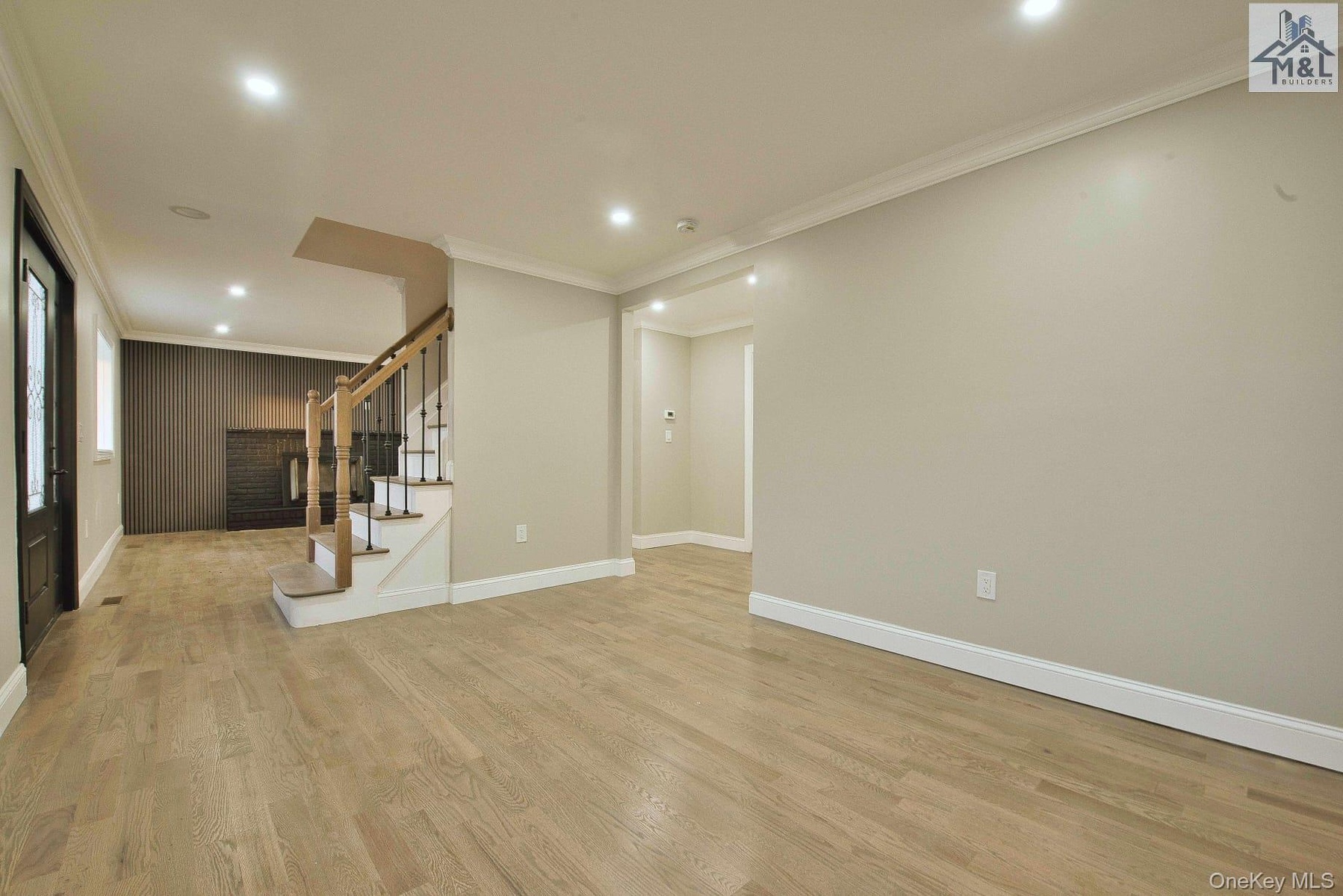 - Unfurnished living room with ornamental molding, stairway, light wood finished floors, and recessed lighting