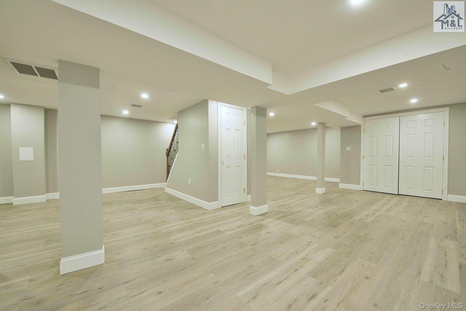- Finished below grade area featuring stairway, light wood-style floors, and recessed lighting