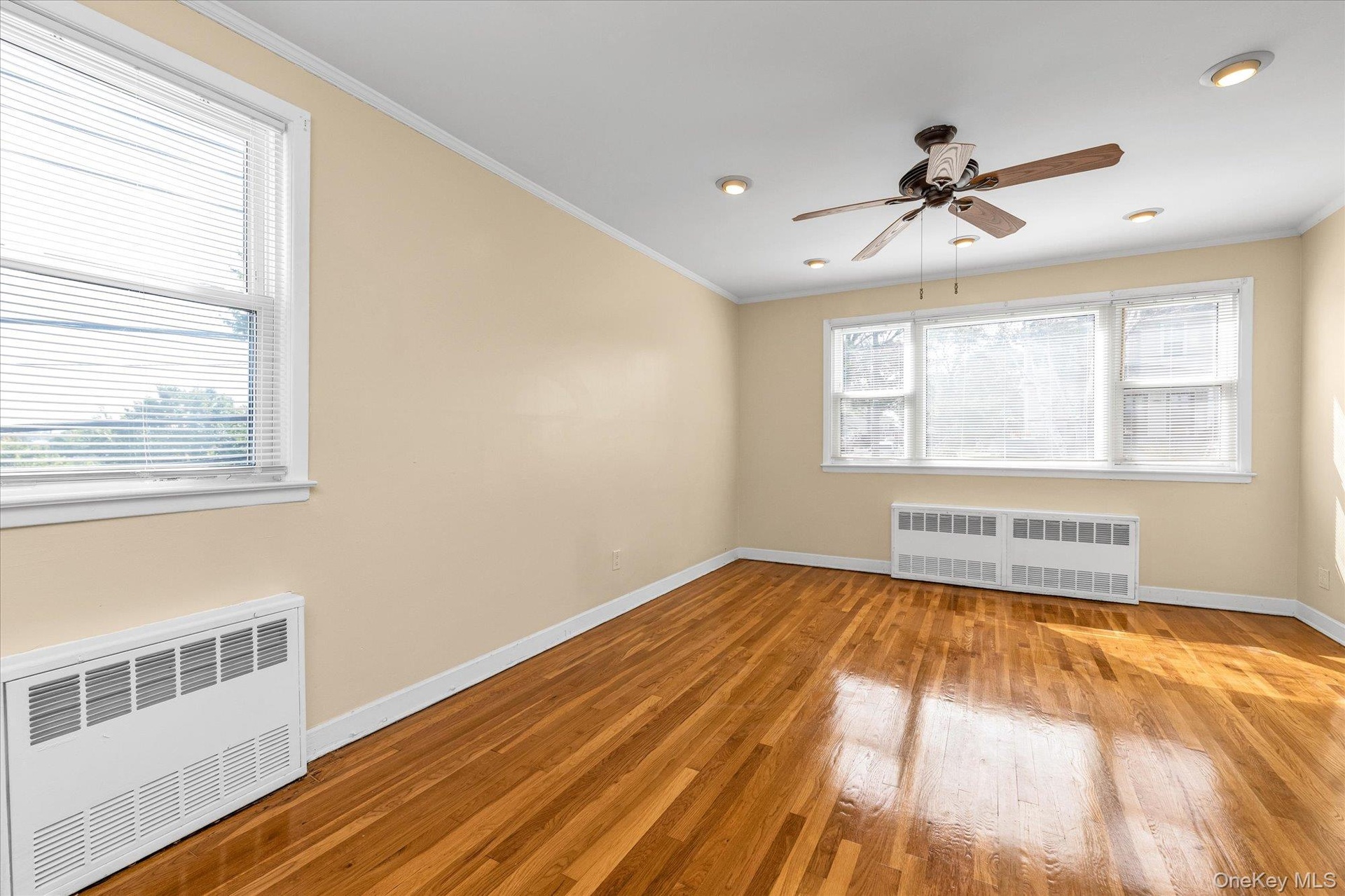 - Empty room with radiator, ornamental molding, light wood-style flooring, and ceiling fan