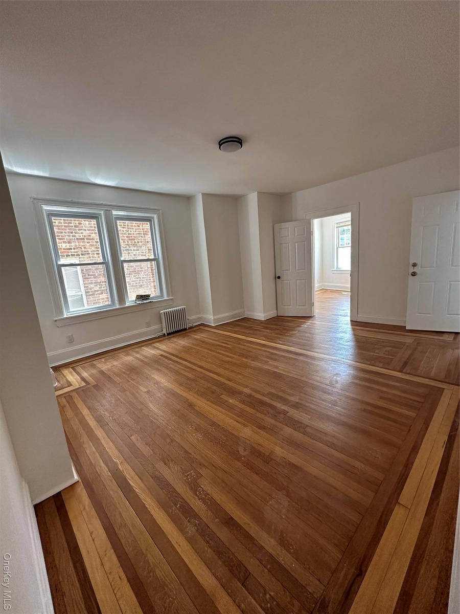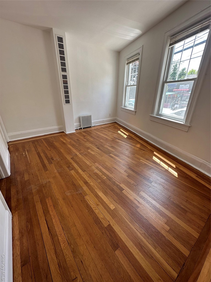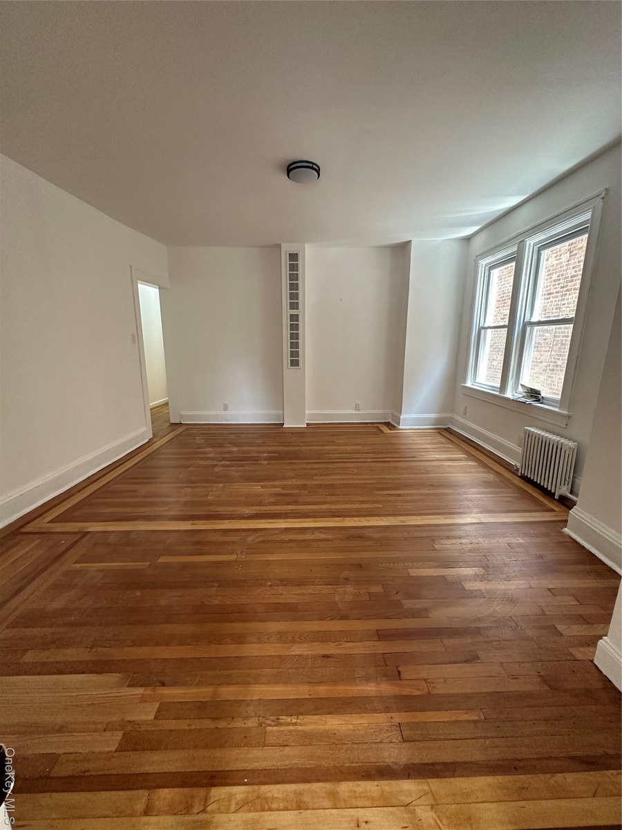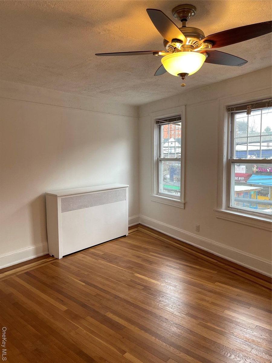 - Empty room featuring hardwood / wood-style flooring, radiator heating unit, a textured ceiling, and ceiling fan