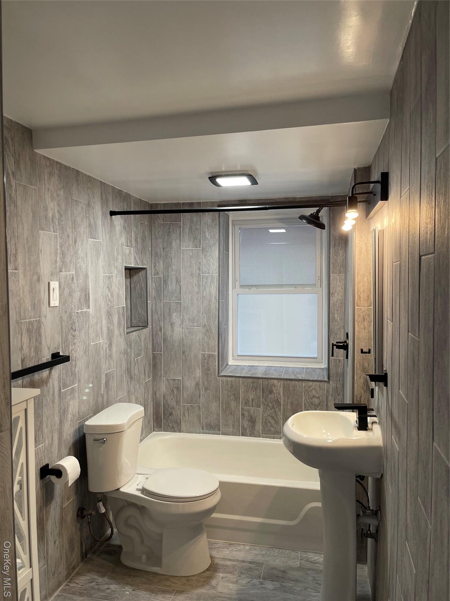 - Full bathroom with tile walls, shower combination, and wood finished floors