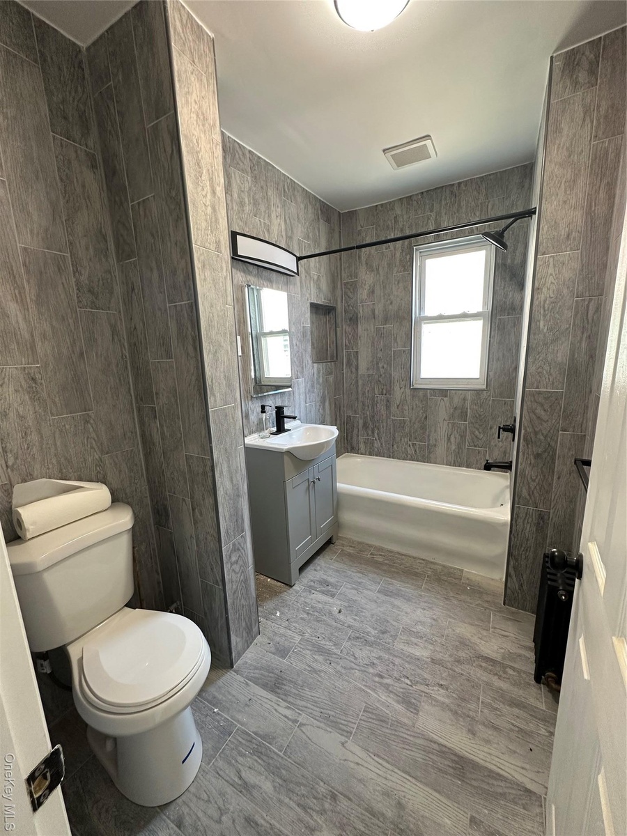 - Bathroom featuring tile walls, vanity, and bathtub / shower combination