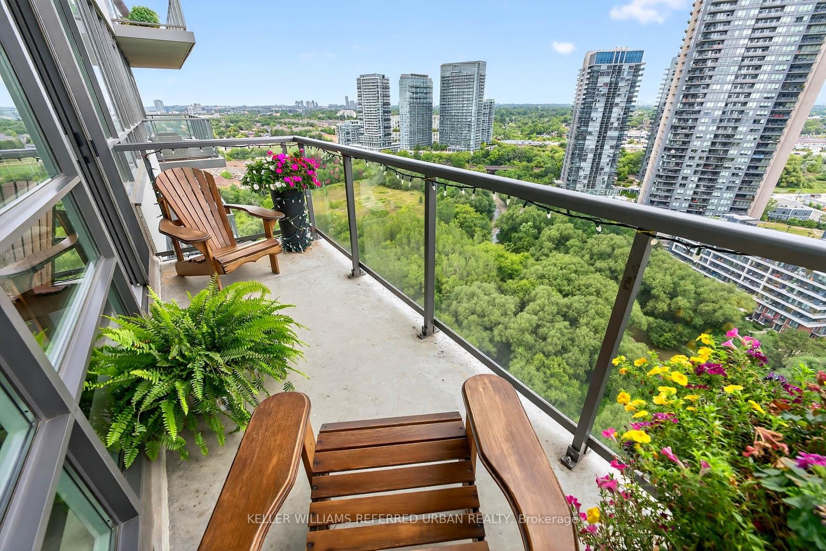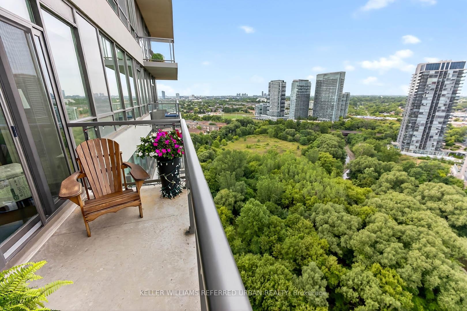 Welcome to this bright and well maintained 1 Bedroom Den condo with parking and locker at 15 Legion Rd, Suite 2305, featuring a coveted ravine view and spectacular Toronto skyline ...