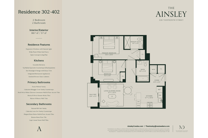 Introducing Residence 402 at The Ainsley, a spacious and sophisticated 2-bedroom, 2-bathroom home that combines modern luxury with outdoor living. Spanning 867 square feet, this residence features a generous layout and private outdoor space, making it perfect for both entertaining and everyday living.