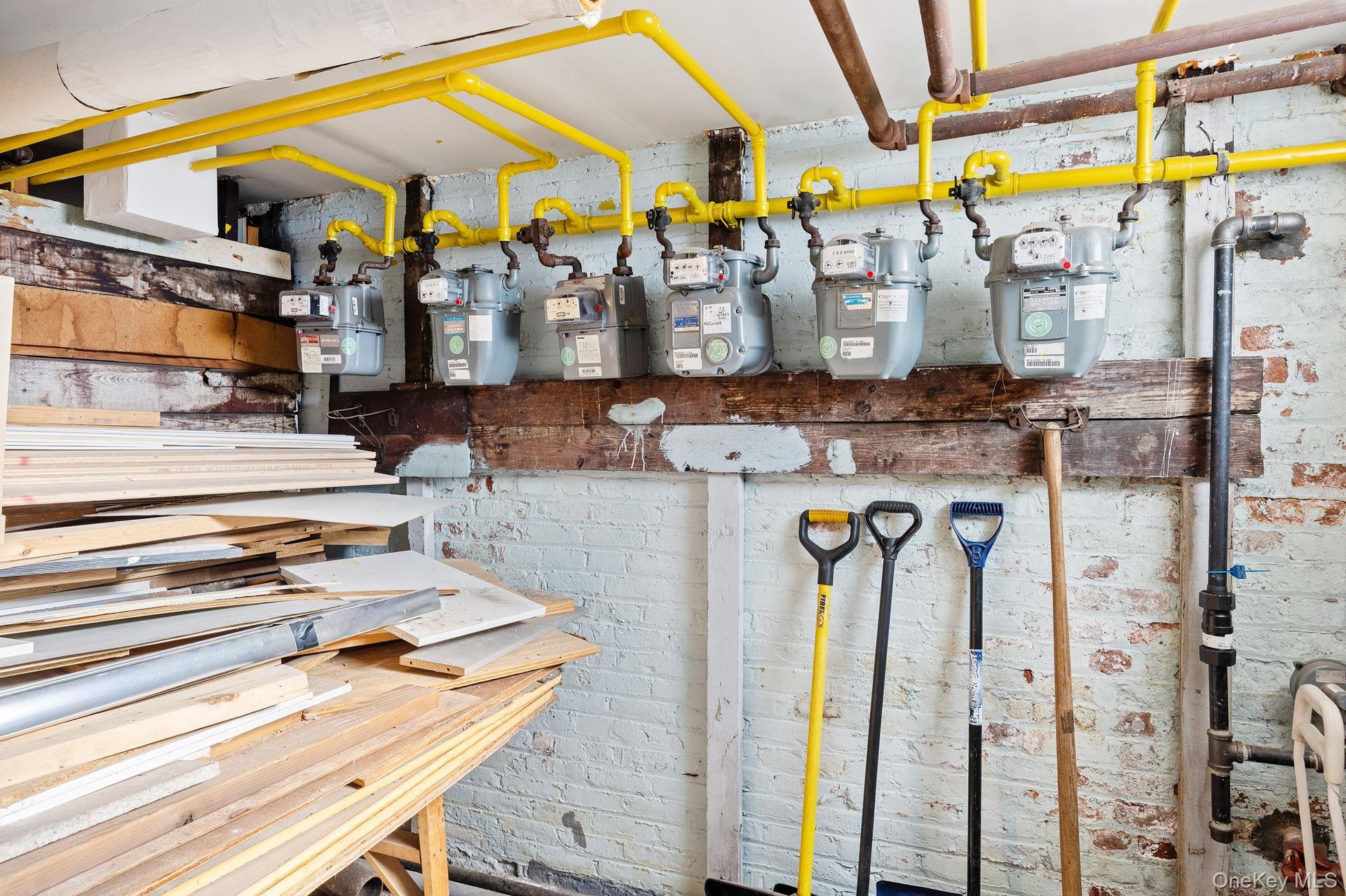 - Basement with freestanding refrigerator, heating fuel, gas water heater, and concrete block wall