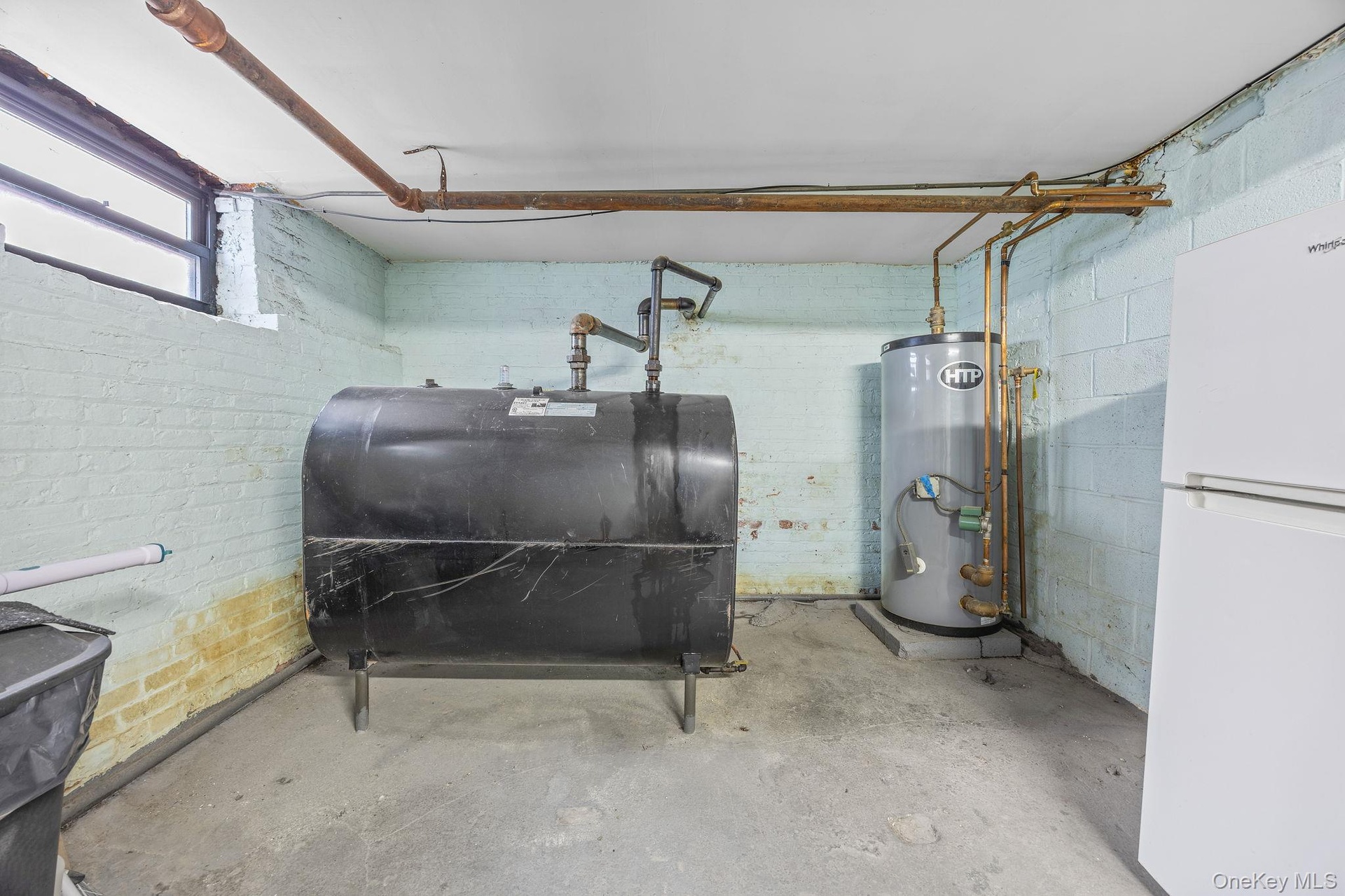 - Unfinished basement with heating fuel, freestanding refrigerator, water heater, and concrete block wall