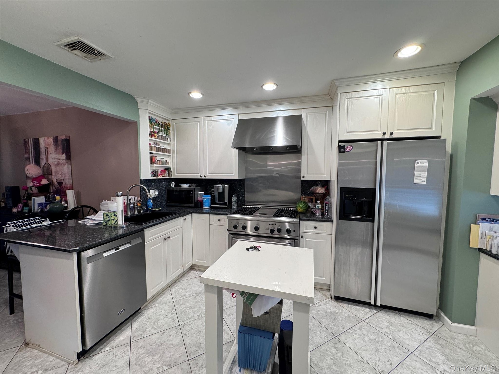 - Kitchen with light tile patterned floors, open shelves, white cabinets, baseboard heating, and recessed lighting