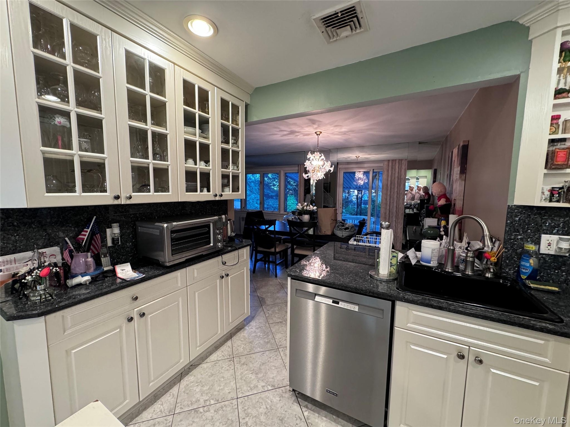 - Kitchen featuring stainless steel dishwasher, glass insert cabinets, dark stone counters, a chandelier, and white cabinets