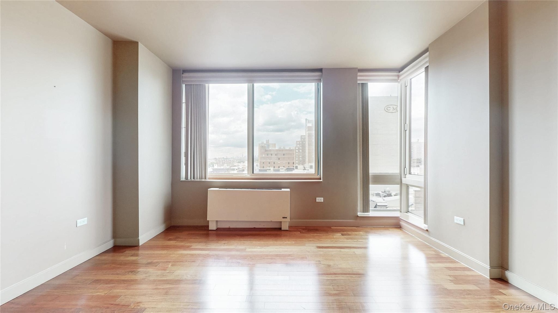 - Spare room featuring radiator, light wood-style floors, and a city view