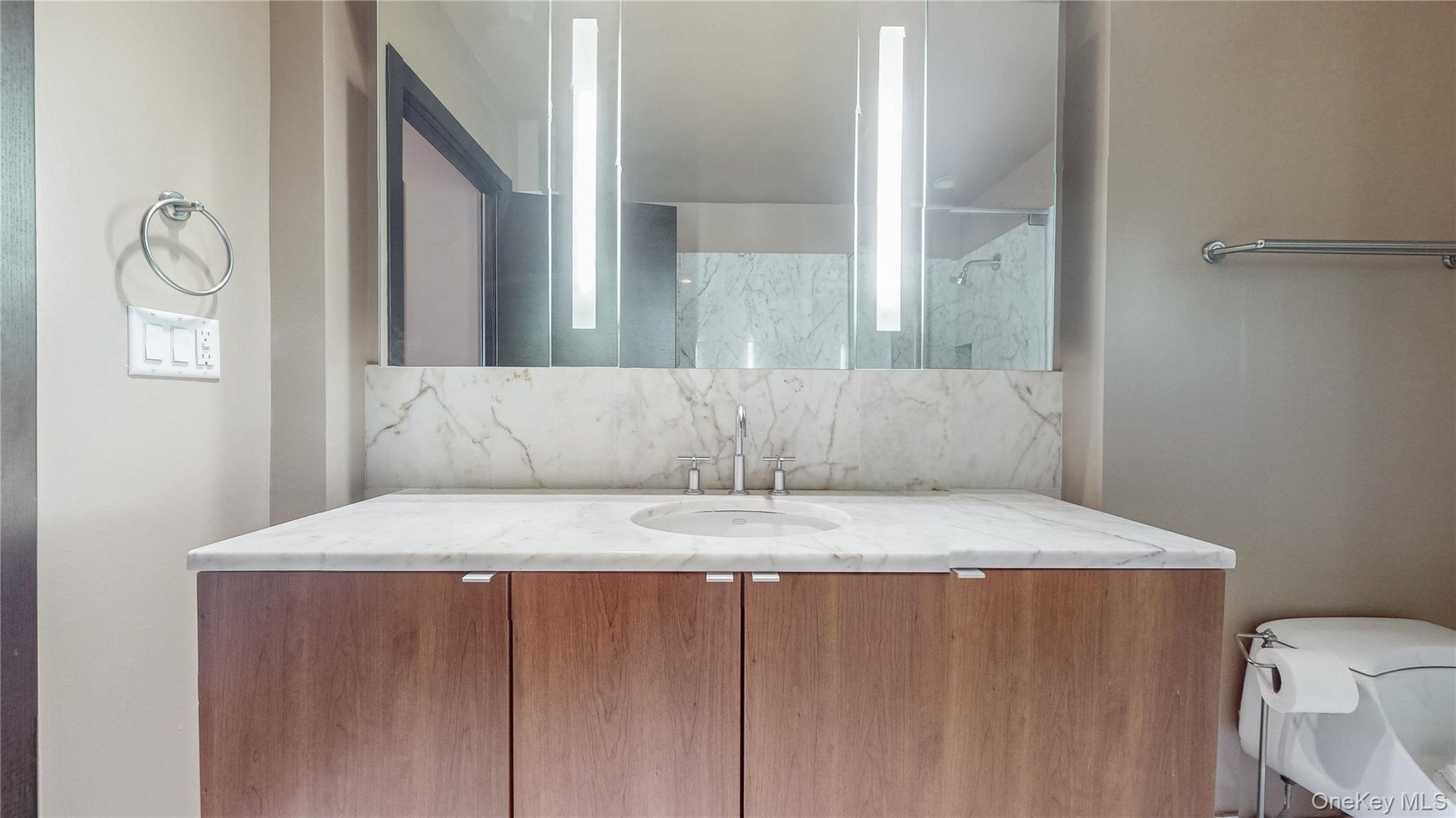 - Full bath featuring backsplash, vanity, and a marble finish shower