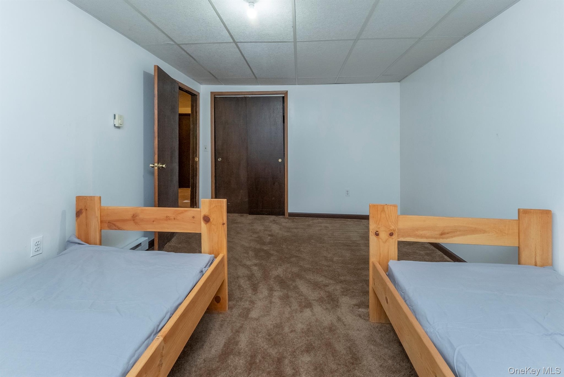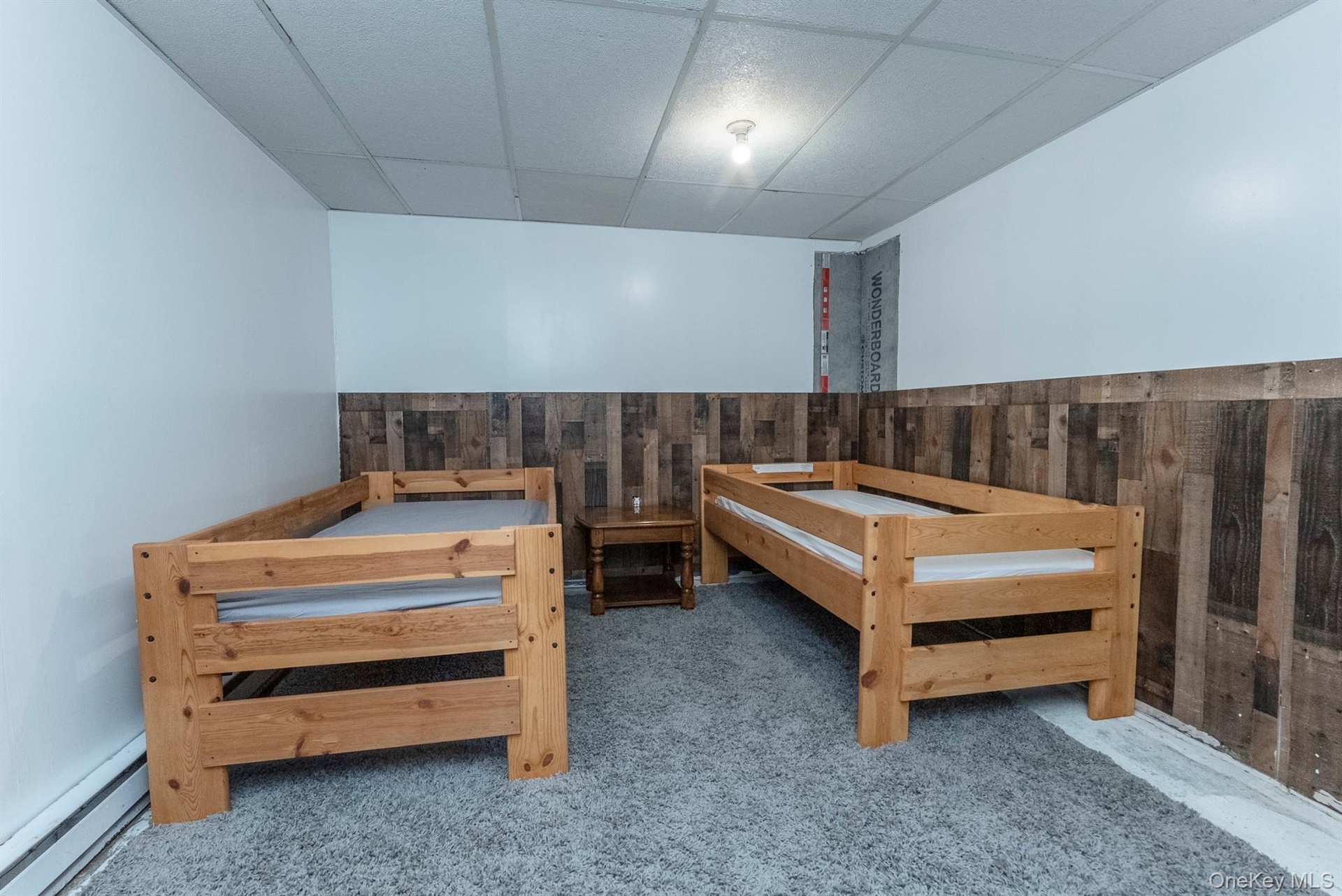 - Carpeted bedroom featuring wooden walls, a baseboard heating unit, and wainscoted walls