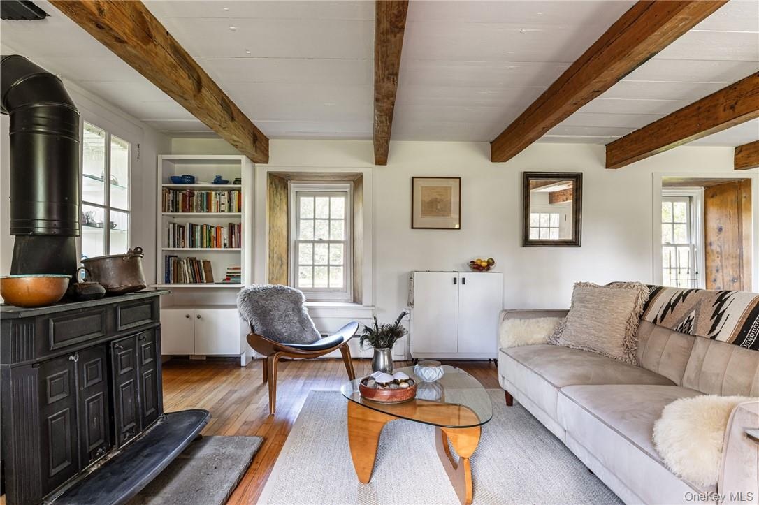 - Stone House -Living room with beam ceiling, wood stove and hardwood floors