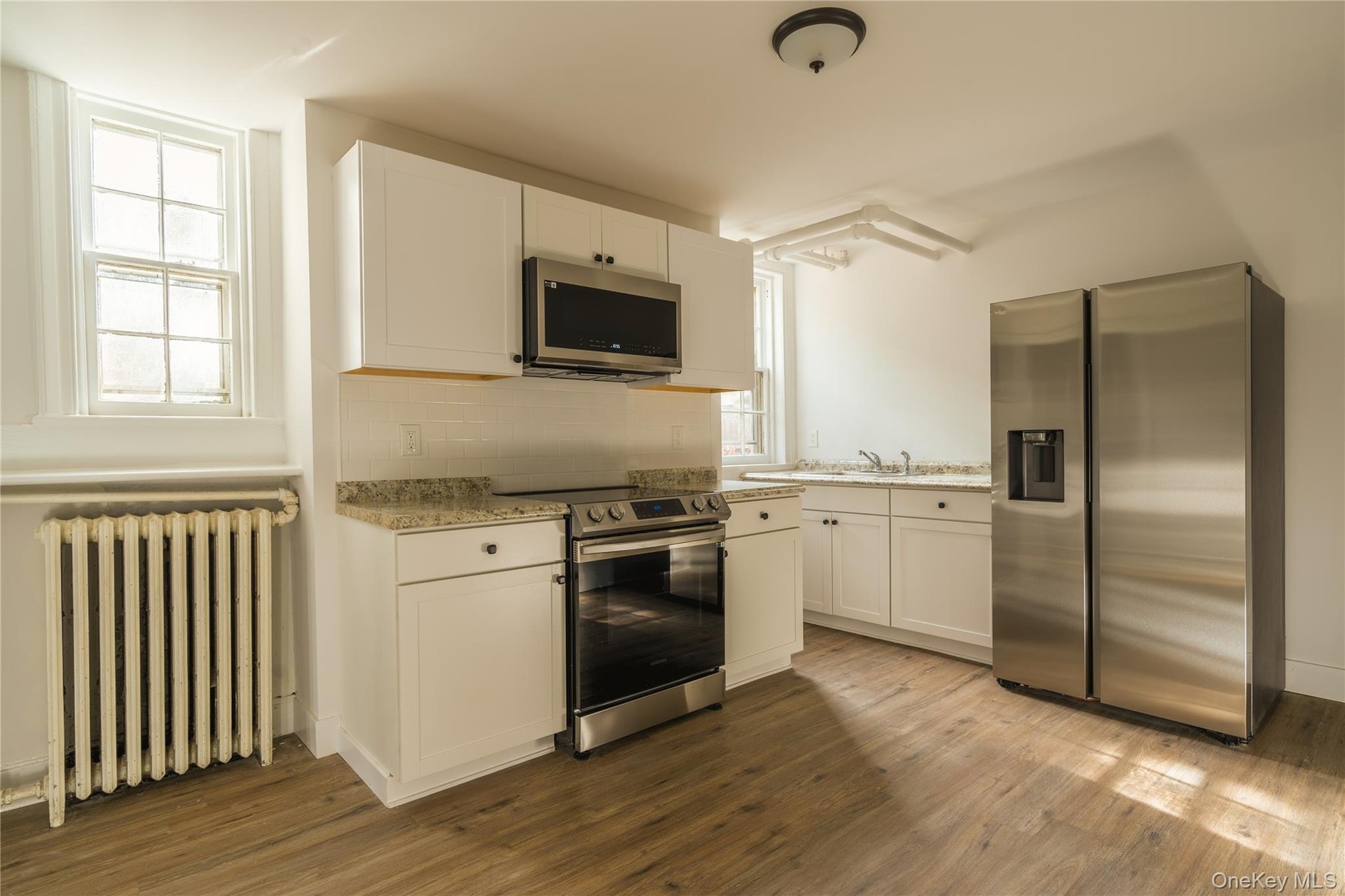 - Kitchen with appliances with stainless steel finishes, tasteful backsplash, radiator, white cabinets, and light wood-style flooring