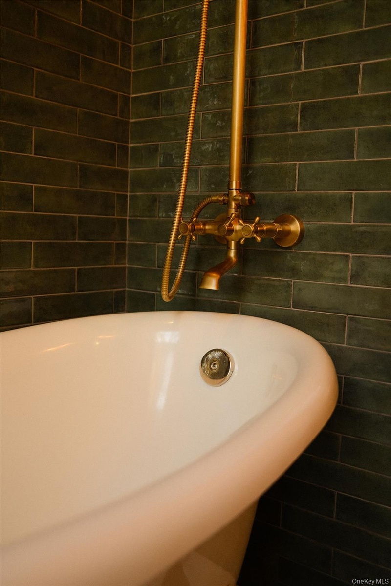 - Bathroom view of tile walls and a tub to relax in