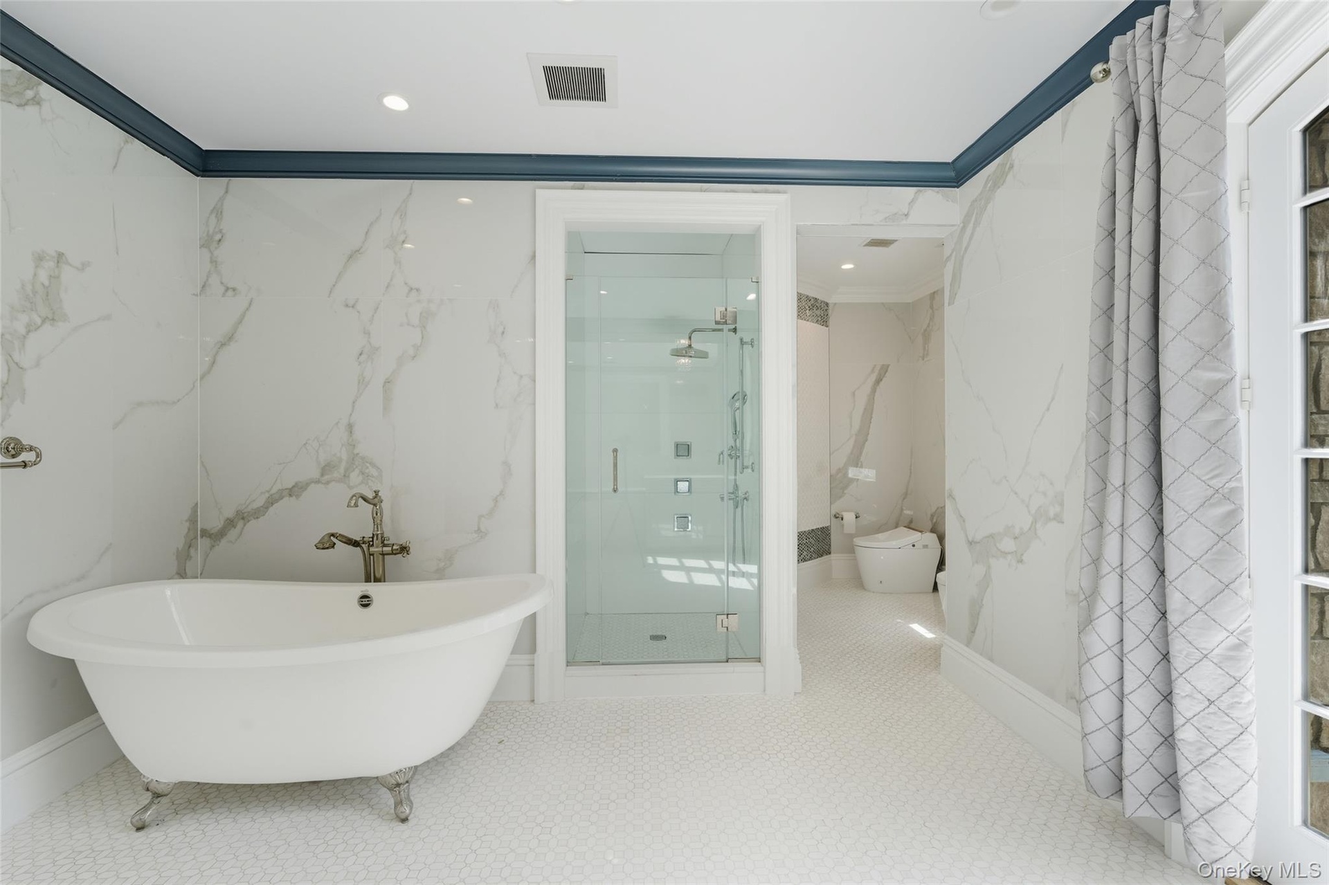 - Bathroom with a soaking tub, a shower stall, crown molding, stone wall, and recessed lighting