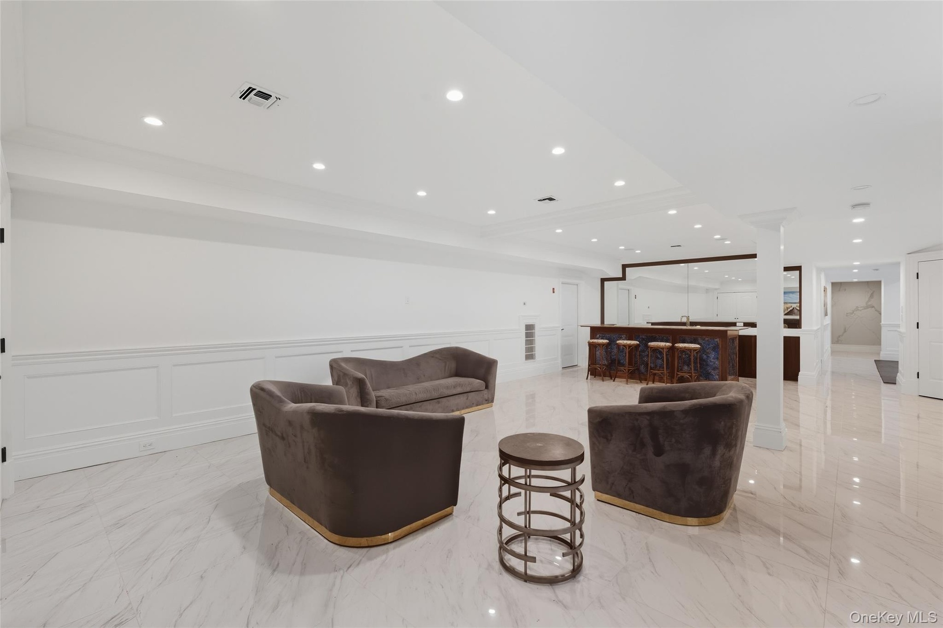 - Living room featuring light marble finish floors, a decorative wall, recessed lighting, wainscoting, and bar area