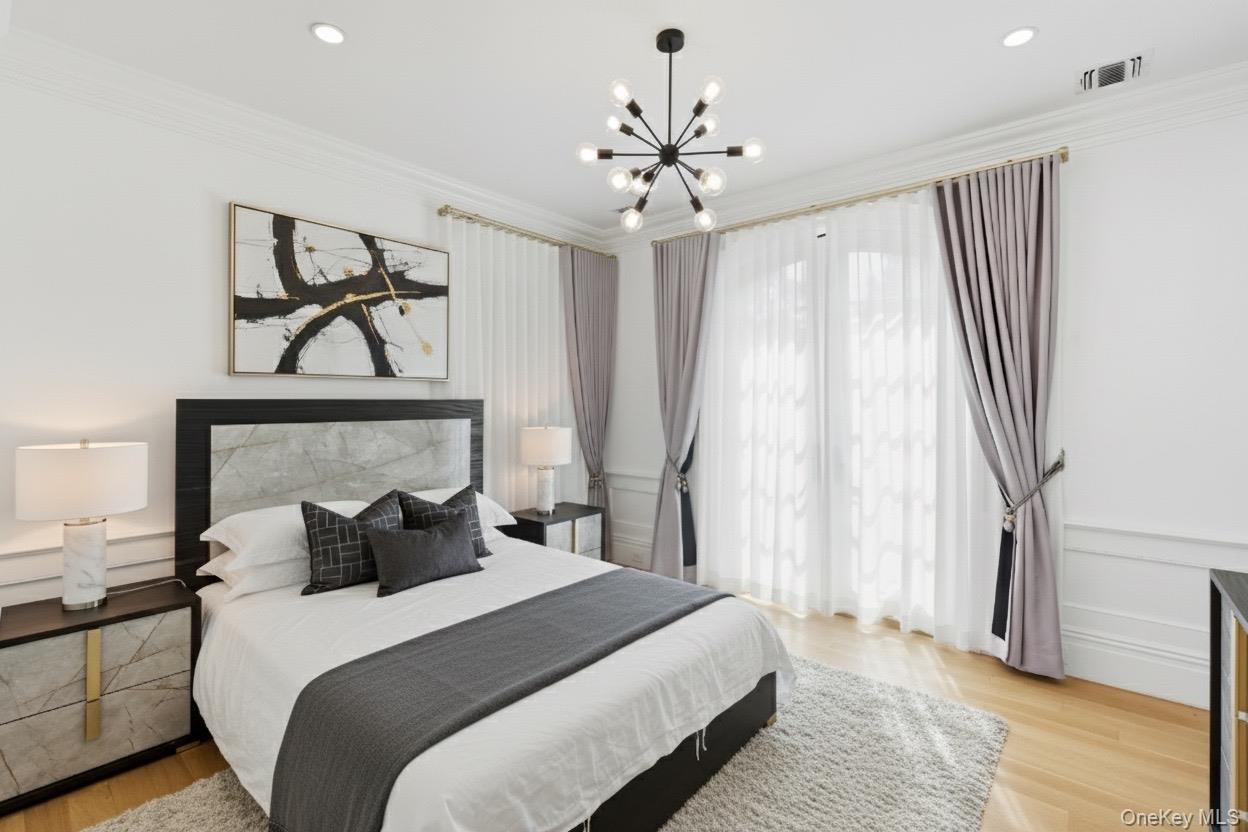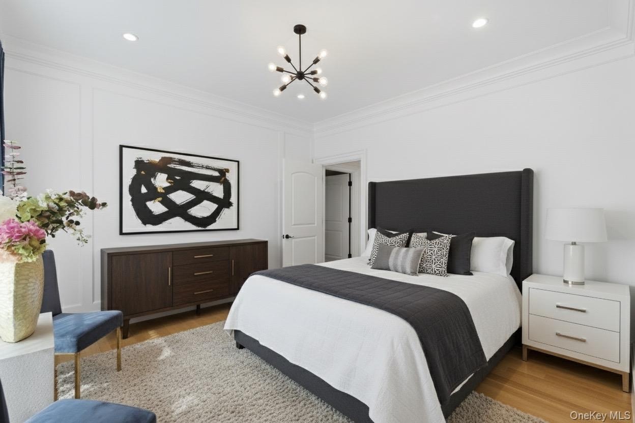 - Bedroom with light wood-style floors, ornamental molding, a chandelier, and recessed lighting