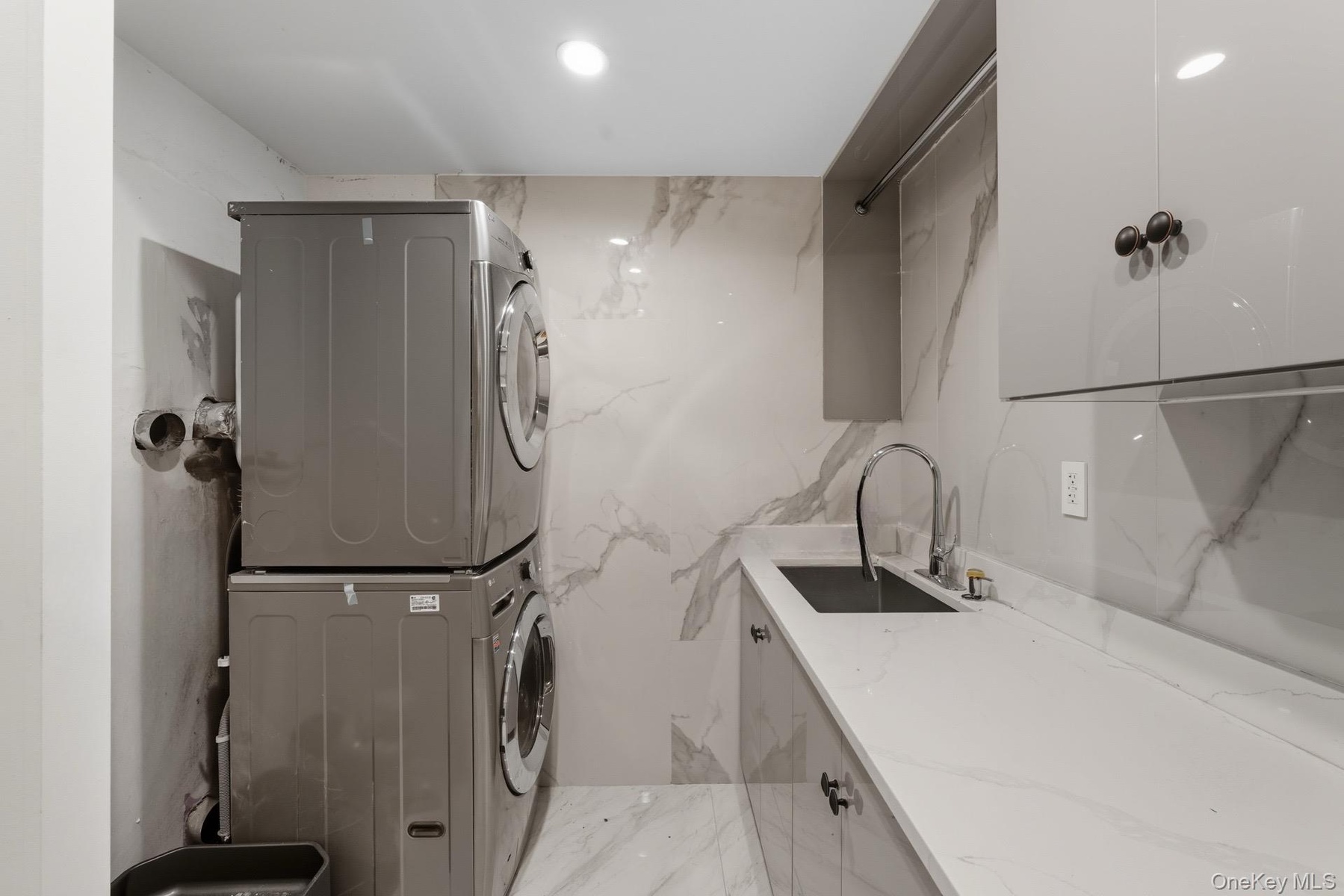 - Washroom featuring stone wall, estacked washer and dryer, recessed lighting, tile walls, and cabinet space