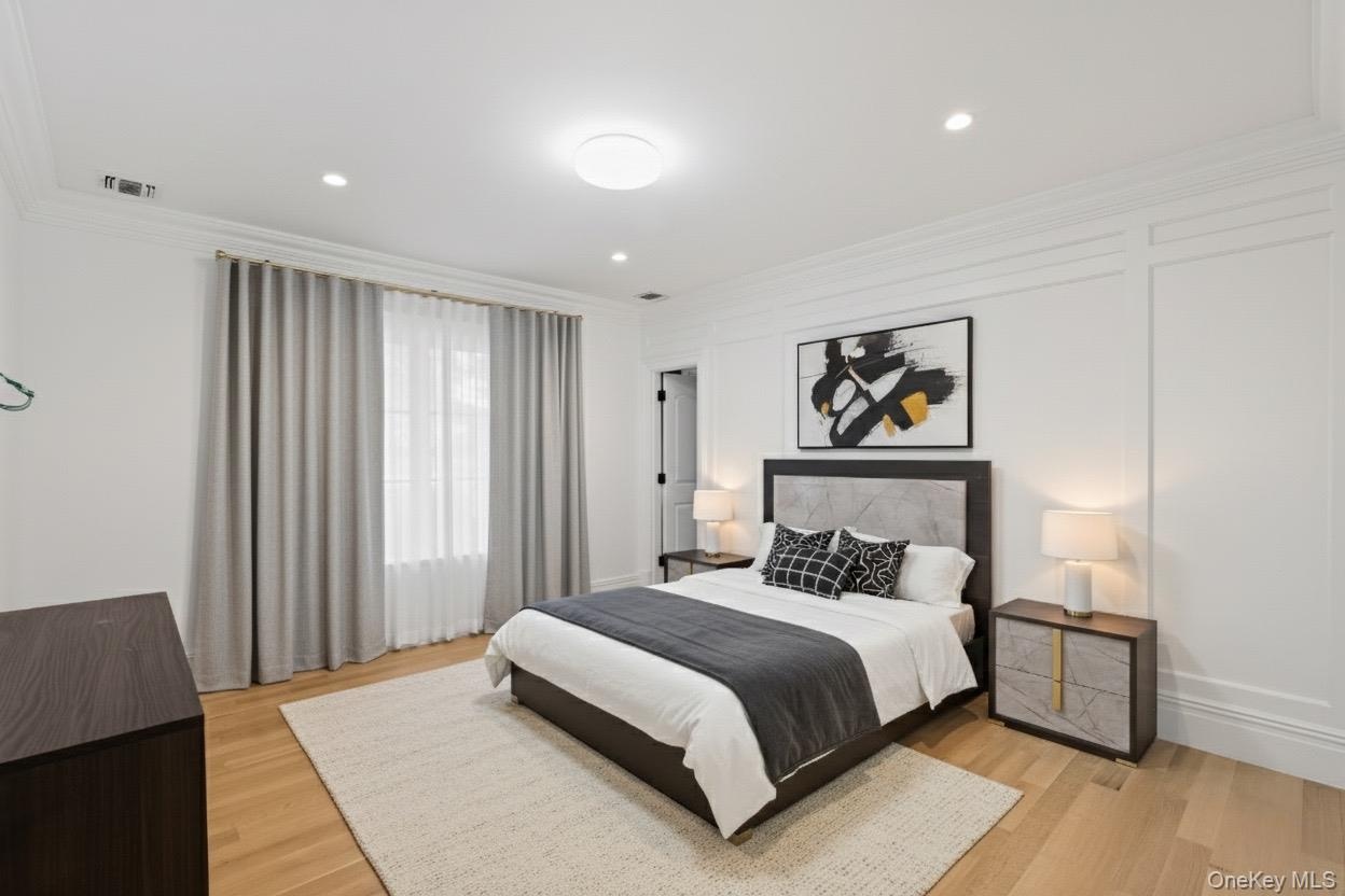 - Bedroom with light wood-style flooring, ornamental molding, and recessed lighting