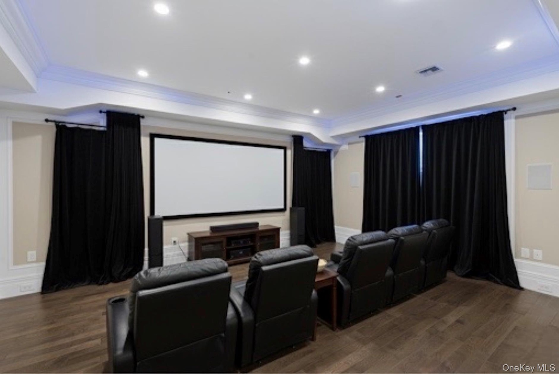 - Home theater room featuring a raised ceiling, ornamental molding, dark wood-type flooring, and recessed lighting
