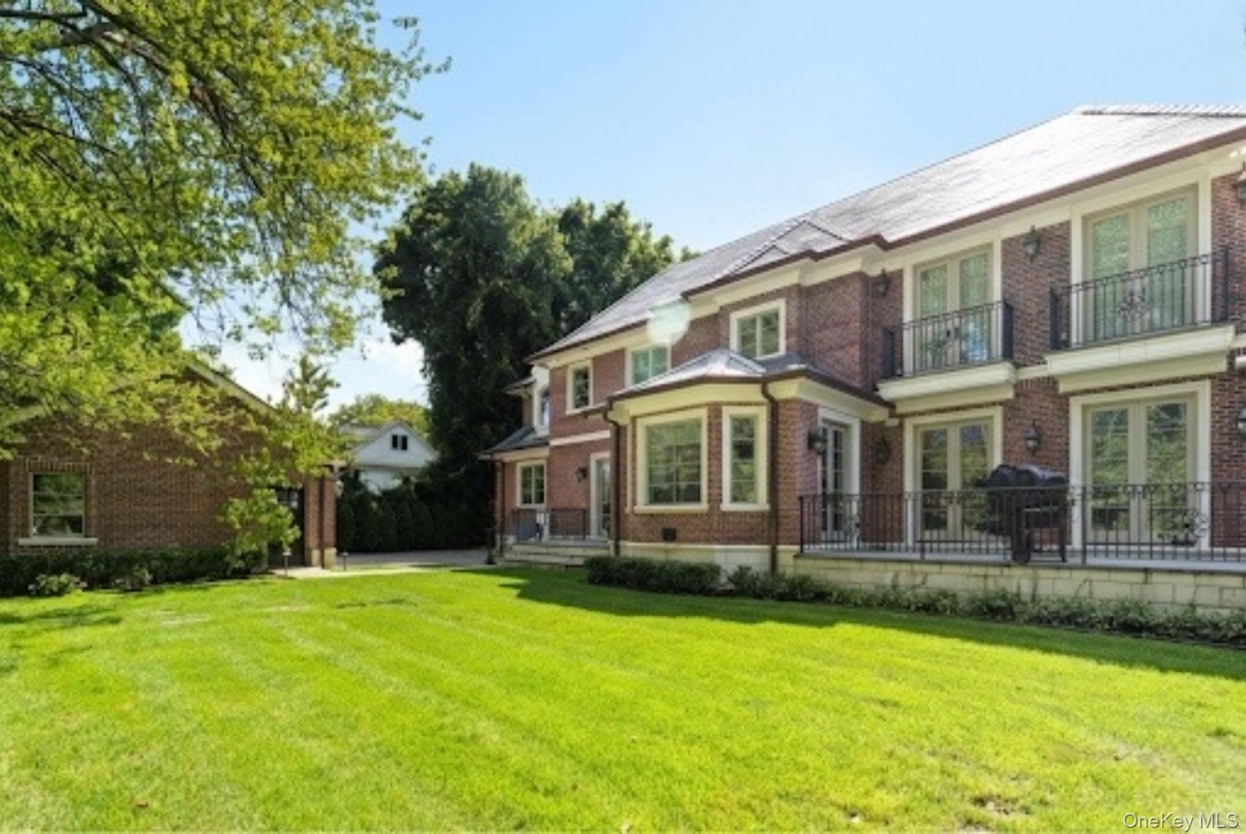 - Rear view of property with a balcony, brick siding, a yard, and french doors