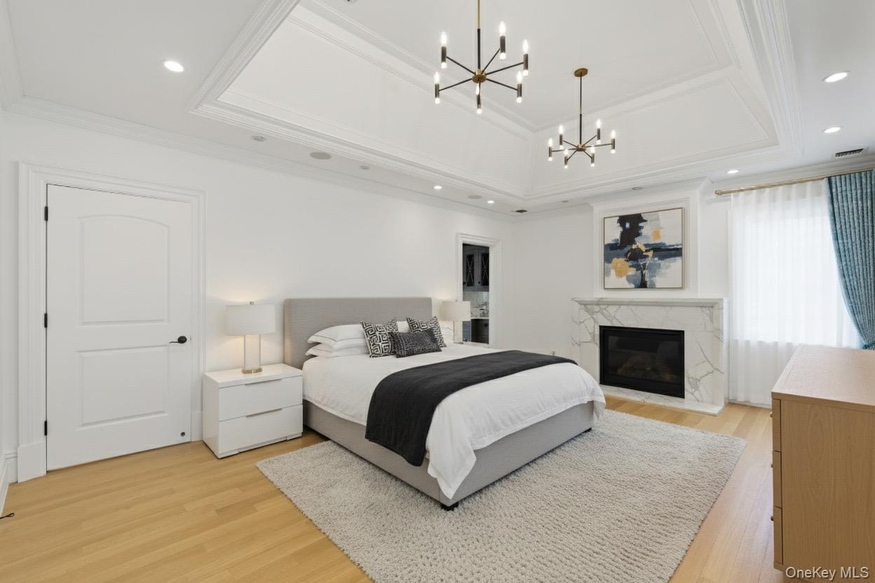 - Bedroom featuring recessed lighting, a premium fireplace, light wood-type flooring, a raised ceiling, and crown molding