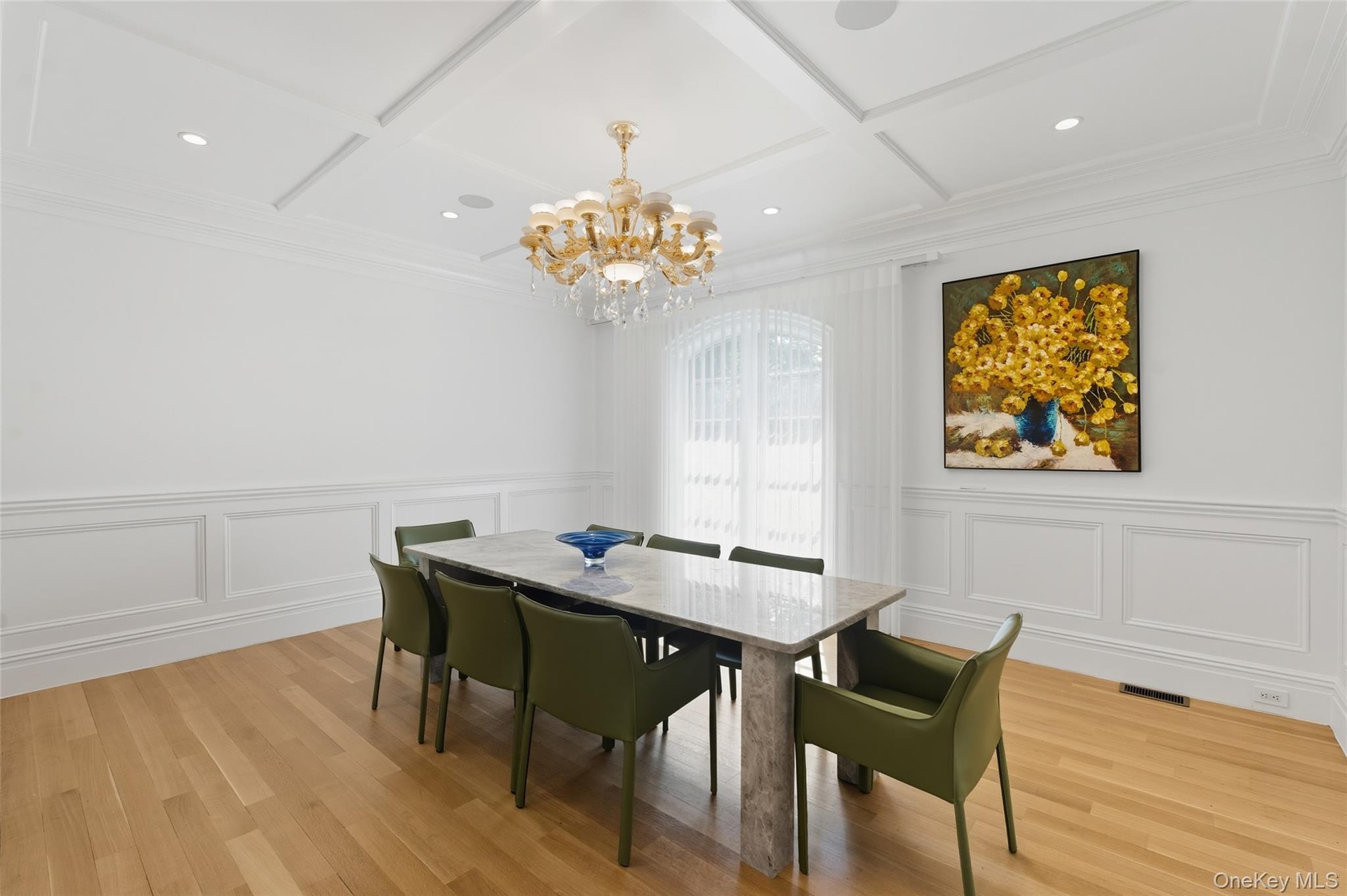 - Dining area with a decorative wall, a chandelier, coffered ceiling, light wood-style floors, and a wainscoted wall
