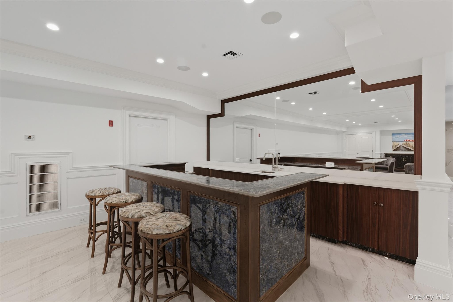- Indoor wet bar with crown molding, recessed lighting, dark brown cabinetry, light marble finish flooring, and dark stone counters
