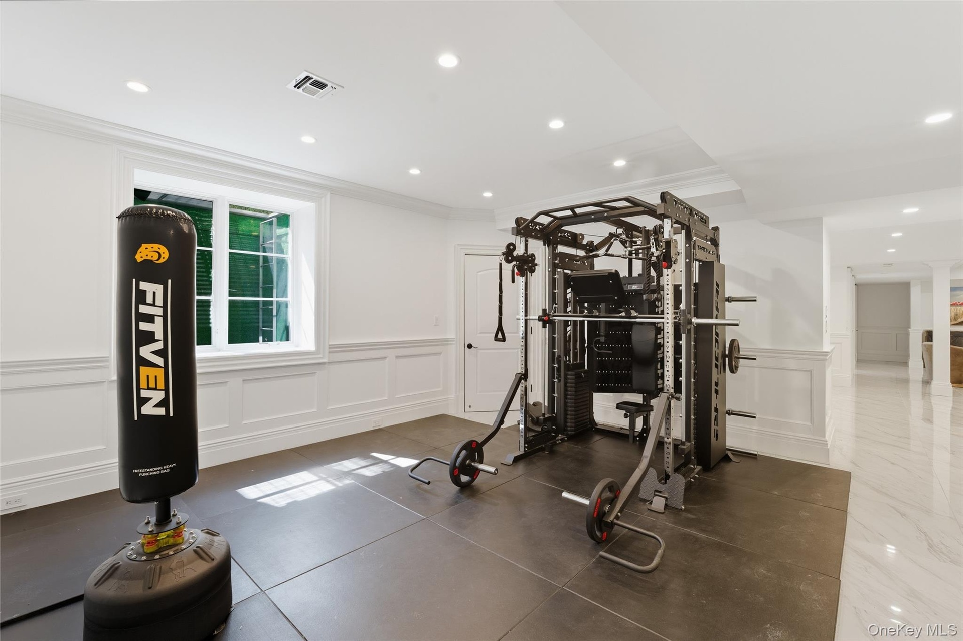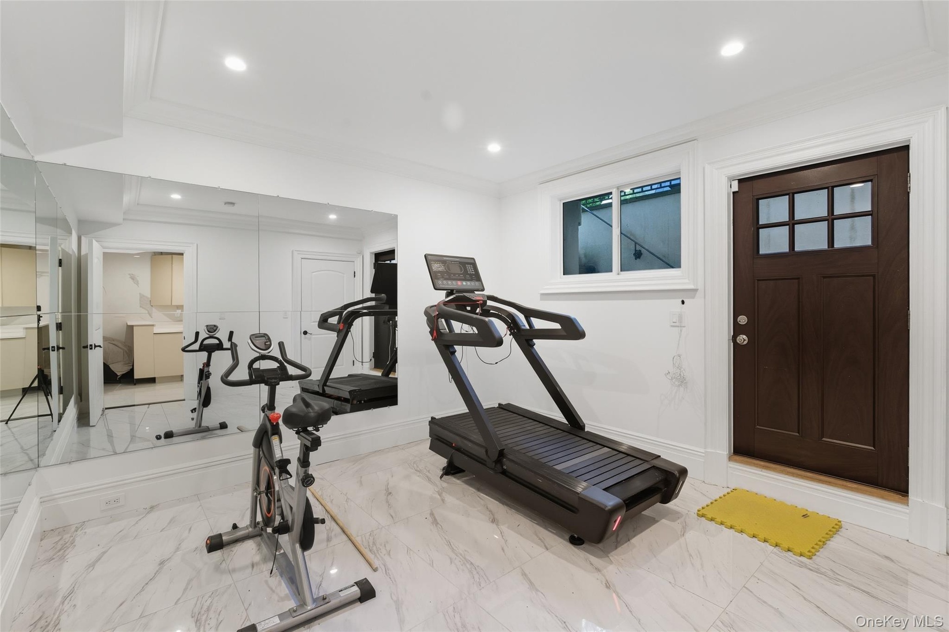 - Workout room with crown molding, recessed lighting, and marble finish floors