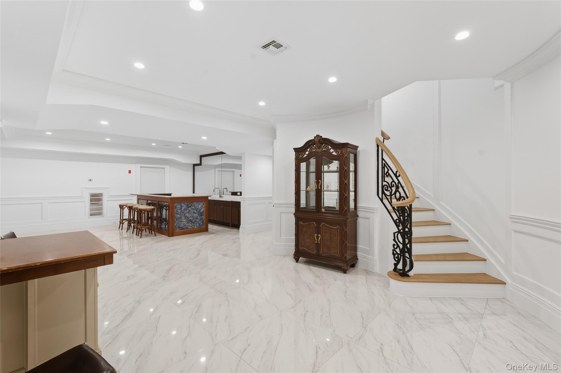 - Entryway featuring a decorative wall, wet bar, recessed lighting, light marble finish flooring, and stairs