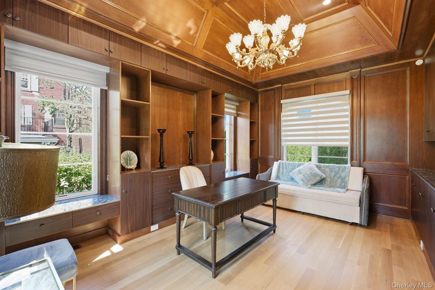 - Office featuring coffered ceiling, wooden ceiling, a chandelier, light wood finished floors, and built in shelves