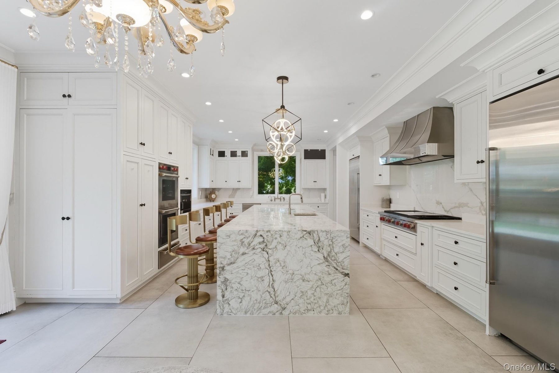 - Kitchen with a chandelier, light stone countertops, white cabinets, decorative light fixtures, and stainless steel appliances