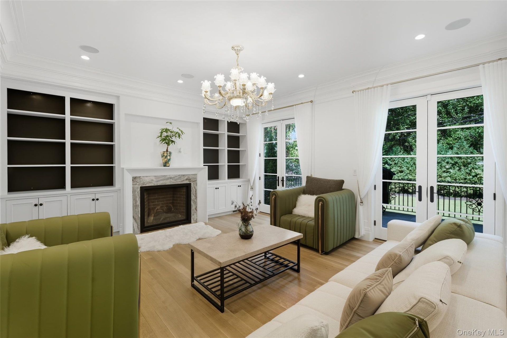 - Living area with crown molding, a premium fireplace, french doors, wood finished floors, and a chandelier
